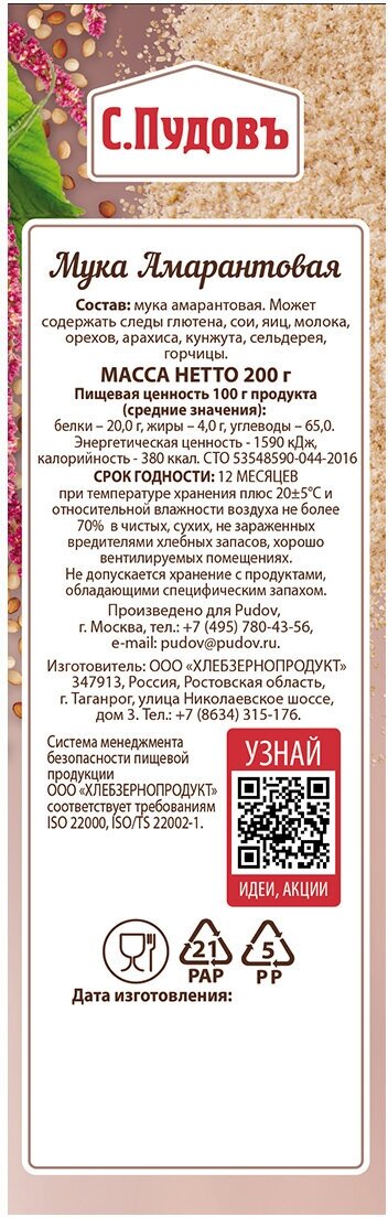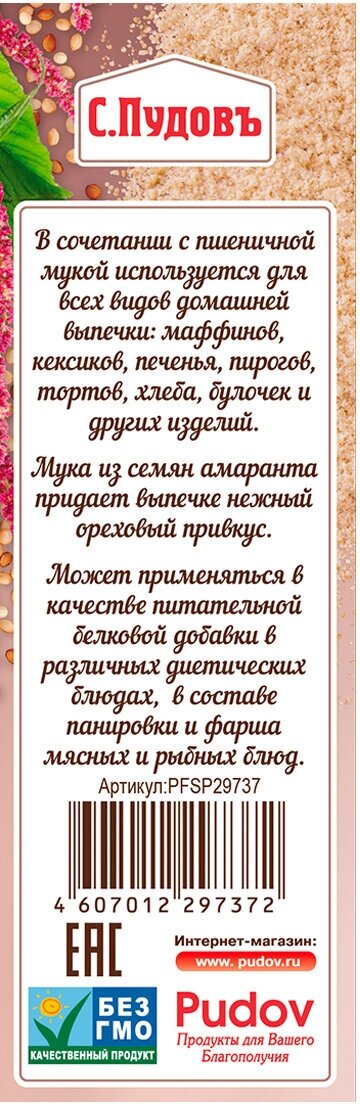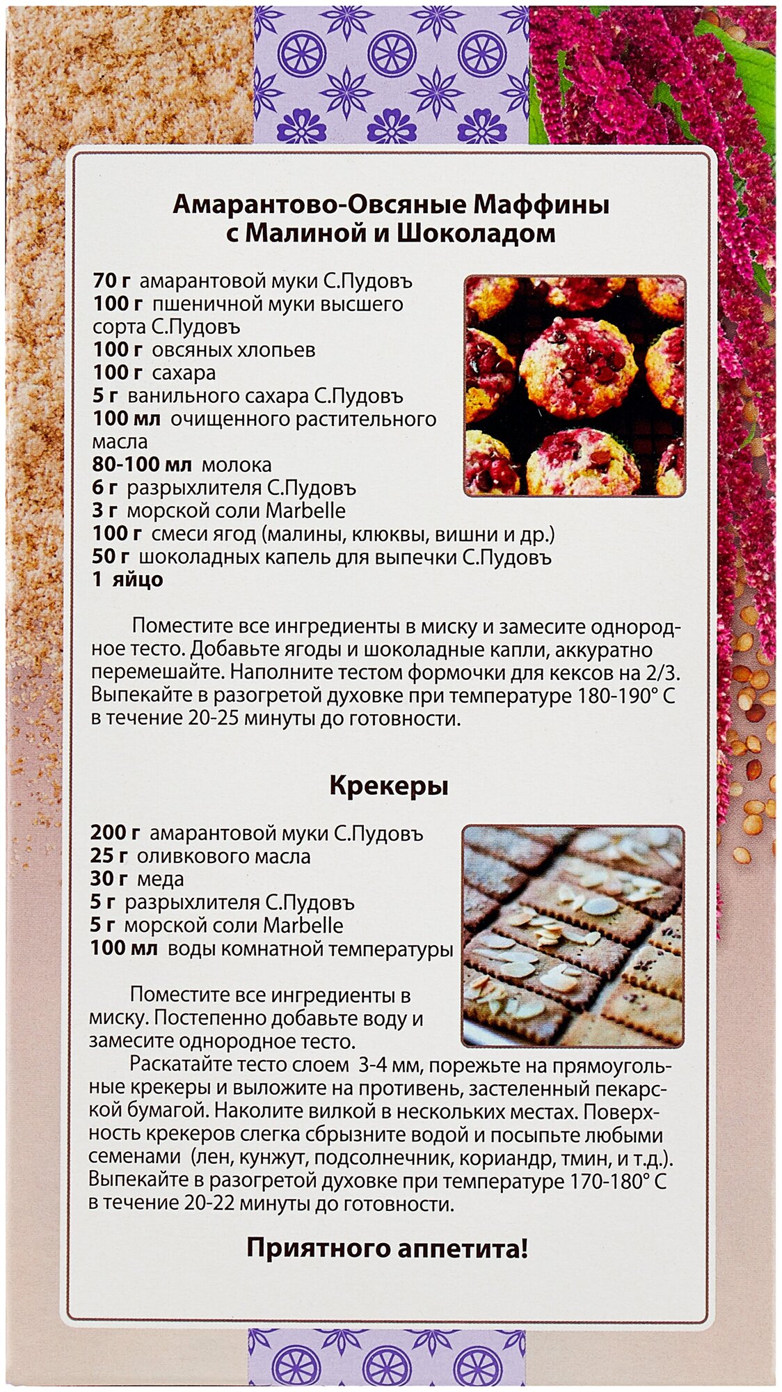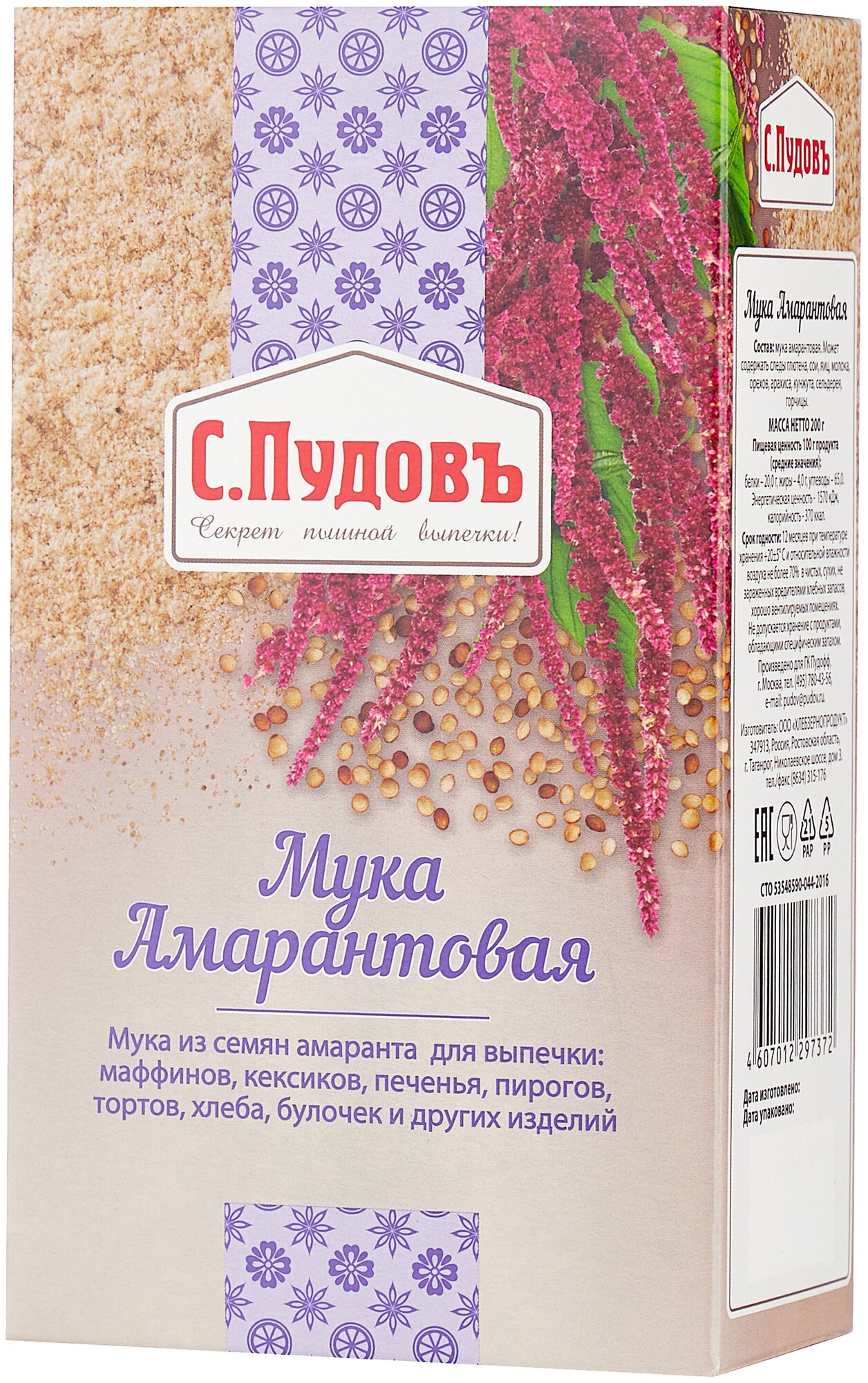 Амарантовая мука «С. Пудовъ» - вкусная и полезная добавка для вашей любимой выпечки.Кексы, маффины, бисквиты, хлеб и пироги с амарантовой мукой имеют узнаваемый ореховый вкус.Кроме выпечки, эту муку часто добавляют в панировку или начинку для мясных, рыбных или овощных блюд, а также в соусы.Амарантовая мука – настоящая находка для тех, кто придерживается правильного питания и ведёт здоровый образ жизни. Белок из муки амаранта хорошо усваивается организмом и содержит все полезные аминокислоты.Ещё амарантовая мука богата клетчаткой, кальцием, магнием и железом.Высококачественная амарантовая мука «С. Пудовъ» - вкусный и полезный выбор!Состав: мука амарантовая.Может содержать следы глютена, сои, яиц, молока, орехов, арахиса, кунжута, сельдерея, горчицыПищевая ценность 100 г продукта (средние значения): белки – 20,0 г, жиры – 4,0 г, углеводы – 65,0.Энергетическая ценность- 1590 кДж, 380 ккал.Срок годности:12 месяцев при температуре хранения +20±5° С и относительной влажности воздуха не более 70% в чистых, сухих, не зараженных вредителями хлебных запасов, хорошо вентилируемых помещениях. Не допускается хранение с продуктами, обладающими специфическим запахом.