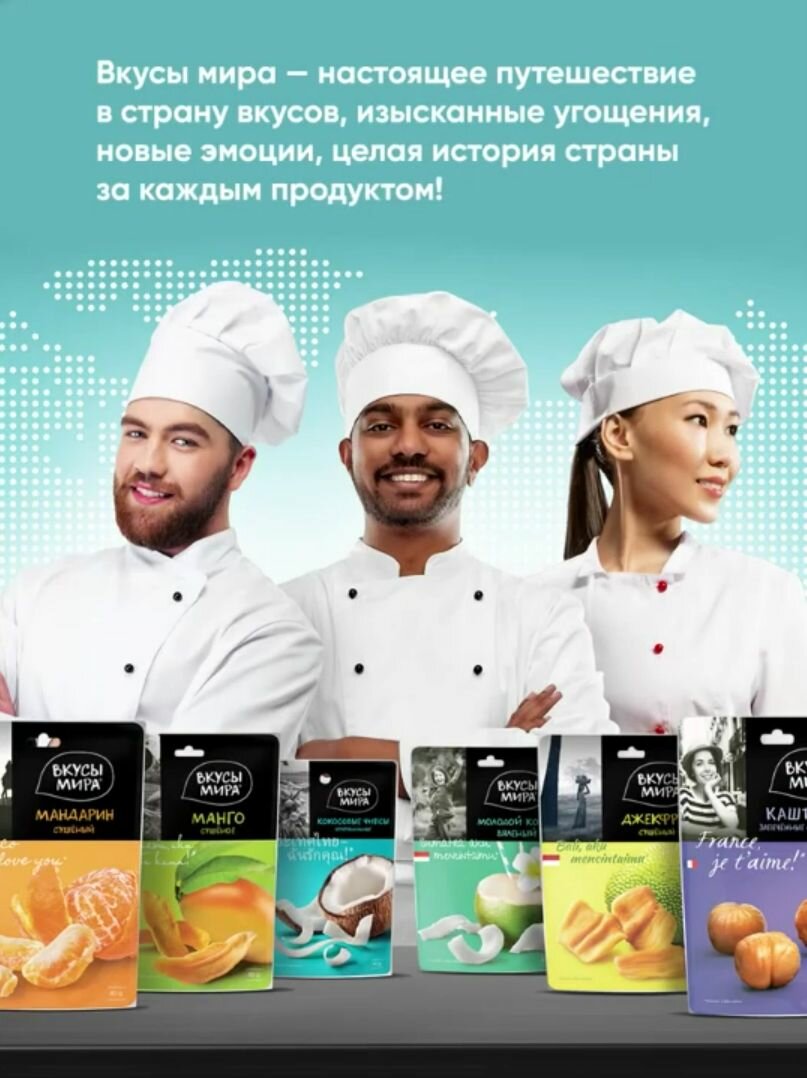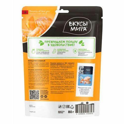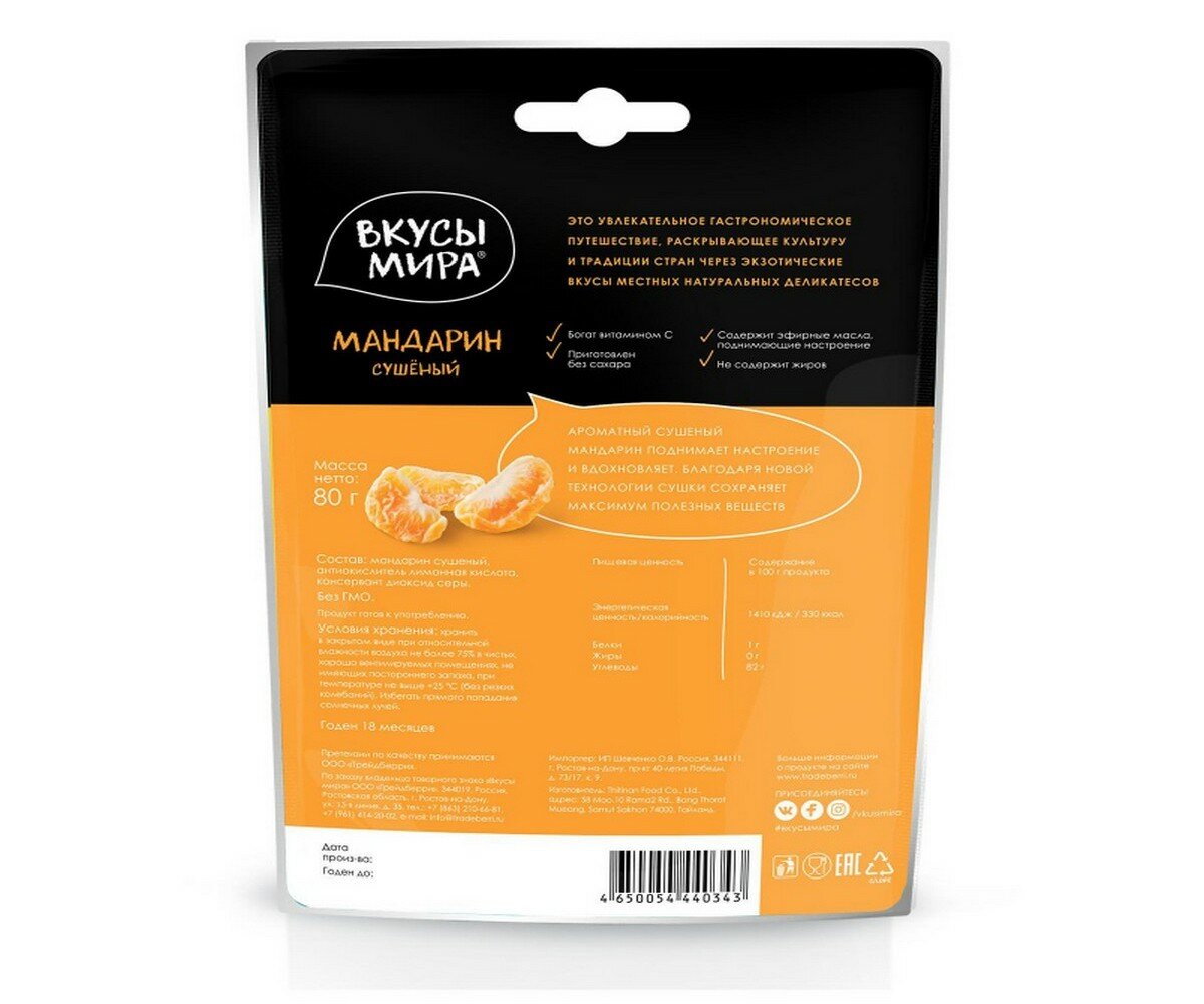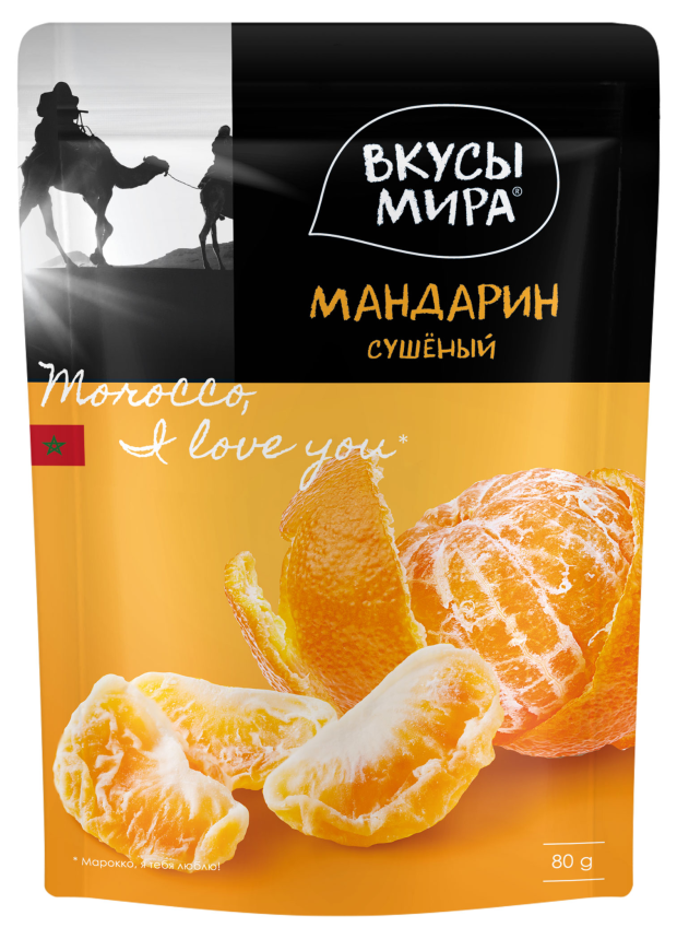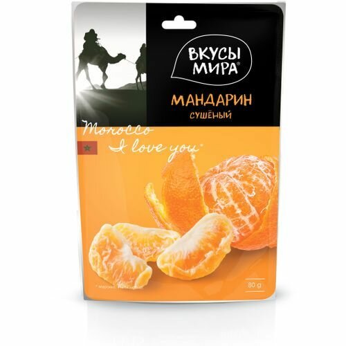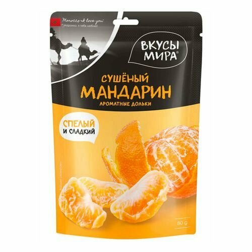 Ароматные дольки сушеного мандарина от Вкусы Мира - это живая энергия солнечных стран в аппетитных снеках. Сладкий вяленый деликатес из плодов экзотического фрукта представлен в более сочных, чем чипсы, ломтиках с чудесным ароматом. Сухофрукт идеален для завтрака, как сладкий десерт к чаю или кофе. Энергетические дольки плодов из тропиков - полезный легкий перекус в школе и на работе.