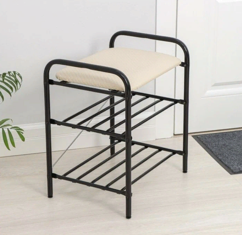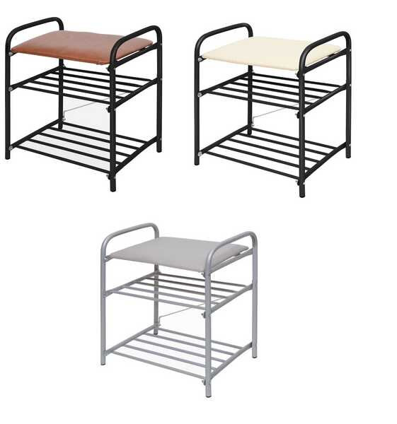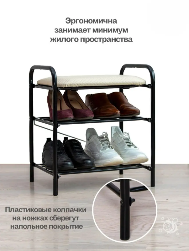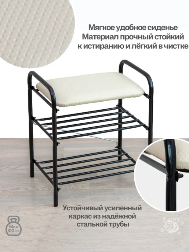 Металлический усиленный каркас. Сиденье выполнено из винилискожи. Две полки для размещения обуви. Пластиковые колпачки на ножках защищают поверхность пола от царапин.