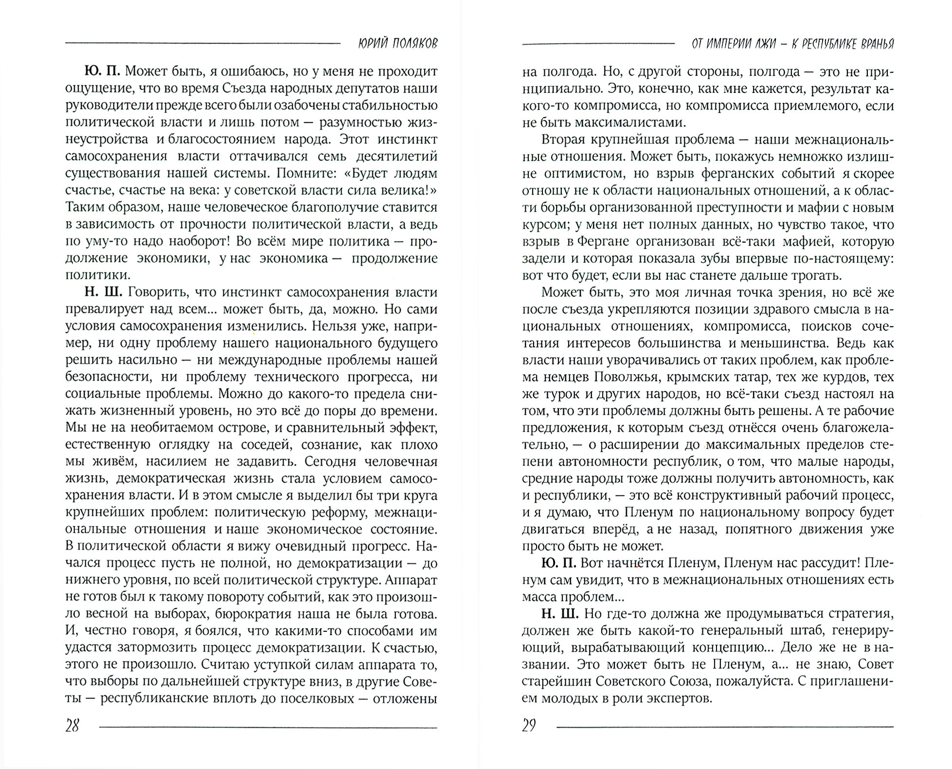В первом сборнике "От империи лжи - к республике вранья" (1986-2005) обсуждаются такие важные события, как перестройка, августовский путч, развал СССР, расстрел Белого дома, первая чеченская война. Автор достаточно резко высказывается о ельцинских реформах и новой власти, критикует ангажированность СМИ, выступает в защиту традиционных культурных ценностей и русской цивилизации. Его прогнозы оказываются удивительно точными.