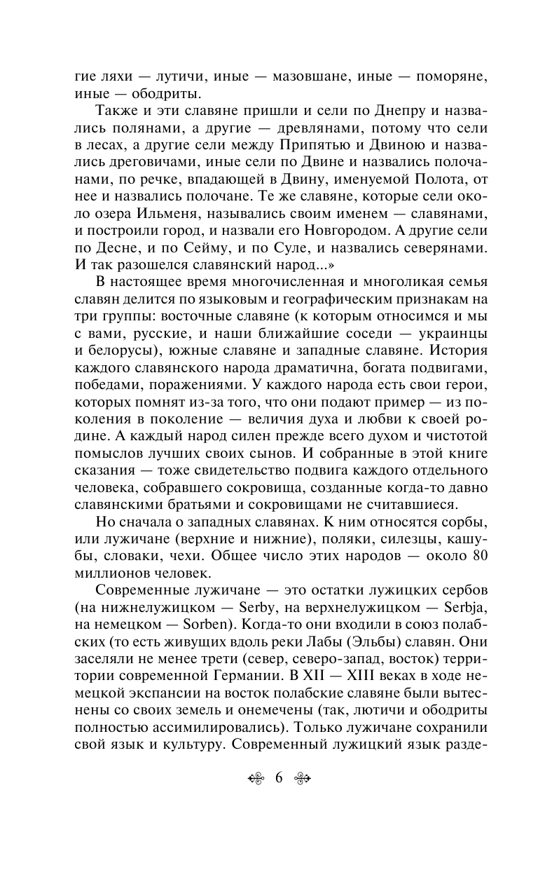 Эта книга — гимн жизни во всех ее проявлениях. В нее вошли разного рода предания (сказки, легенды, мифы) народов, составляющих обширную и самобытную группу западных славян. Удовольствие от чтения этой книги получат и любители занимательных детских сказок, и те, кто ищет в произведениях фольклора поучительные наставления, основанные на многовековом опыте, и приверженцы историй, наполненных мистическим ужасом. Есть в ней место и юмору, и смеху, и сатире. Одни сказки родители будут читать своим малышам на ночь, а другие увлекут даже самых взрослых и искушенных читателей.