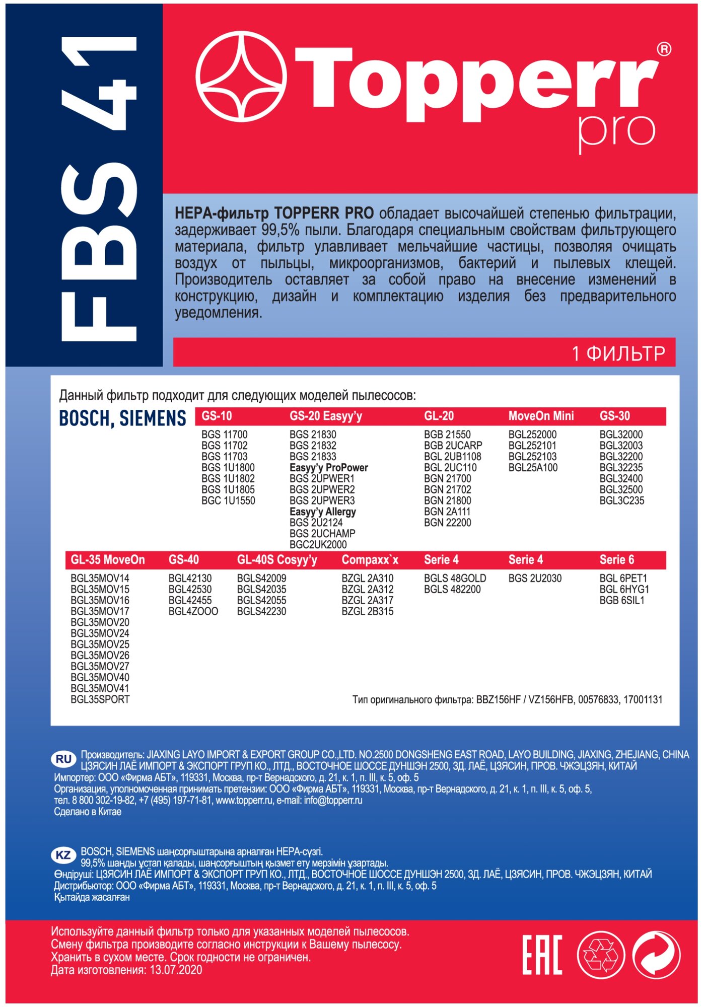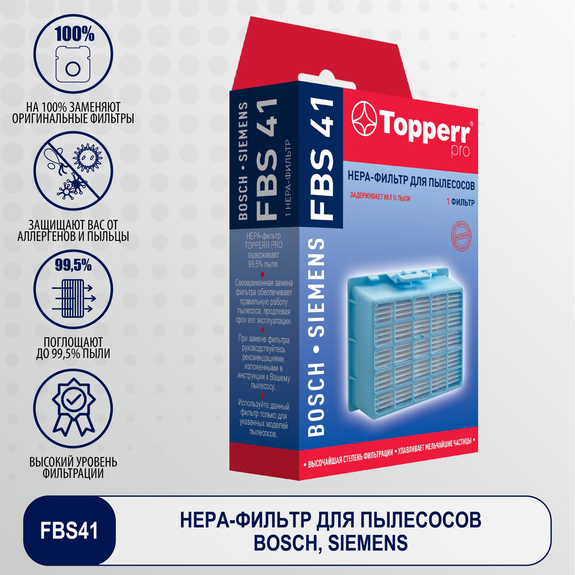 HEPA-фильтр FBS 41 для пылесосов BOSCH и SIEMENS. Обладает высочайшей степенью фильтрации, задерживает 99,5% пыли. Благодаря специальным свойствам фильтрующего материала, фильтр улавливает мельчайшие частицы, позволяя очищать воздух от пыльцы, микроорганизмов, бактерий и пылевых клещей.