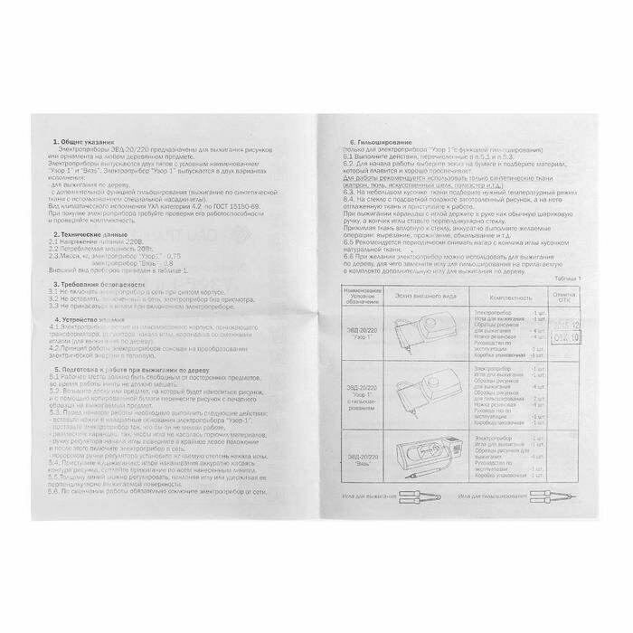 | Комплектация | выжигатель (1 шт + 4 резиновые ножки), игла для выжигания (2 шт), инструкция (1 шт), подставка под прибор (1 шт), лист с рисунком для нанесения |