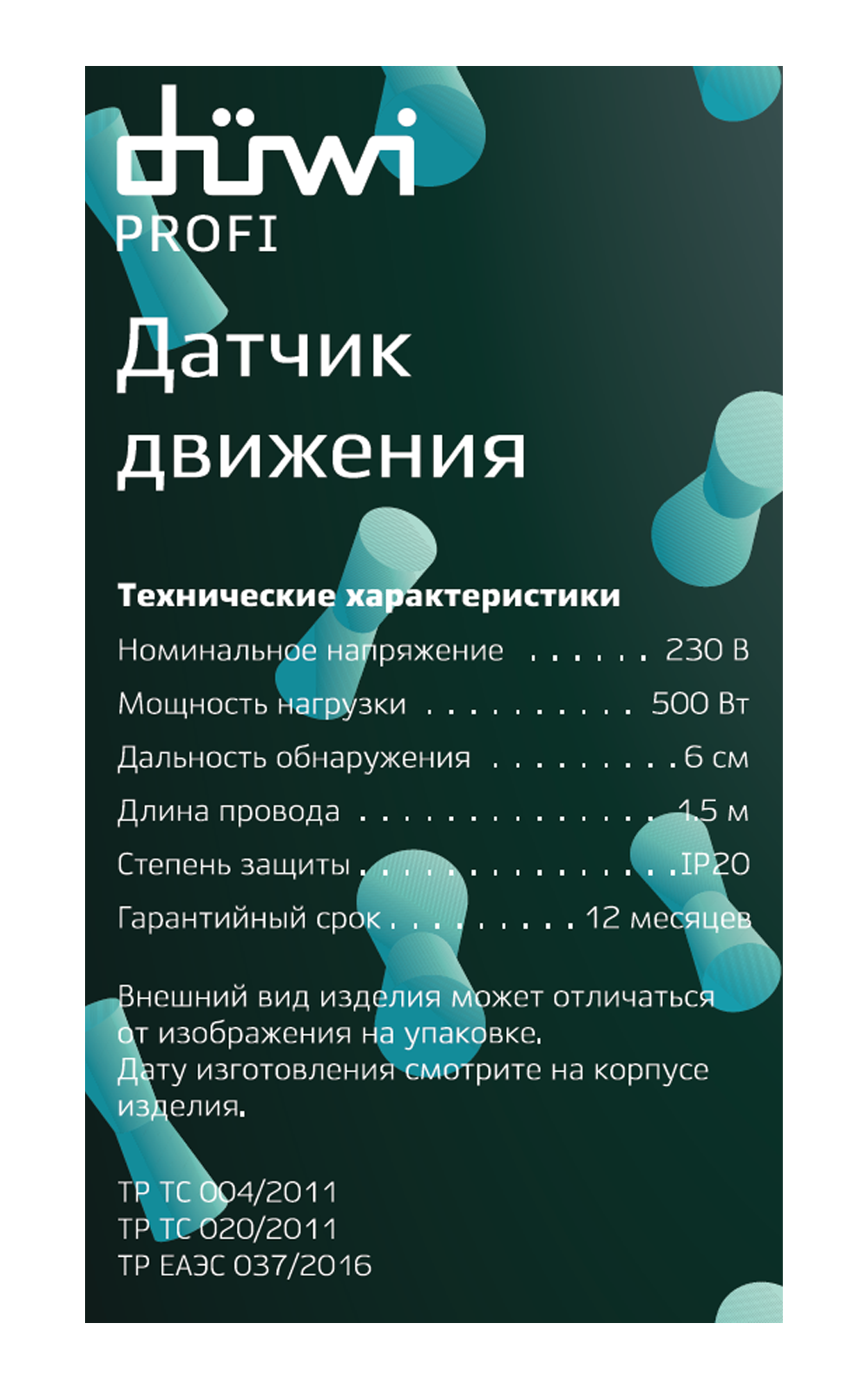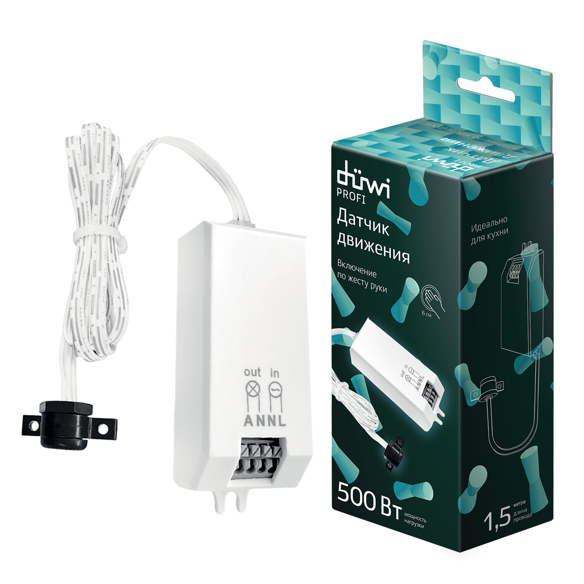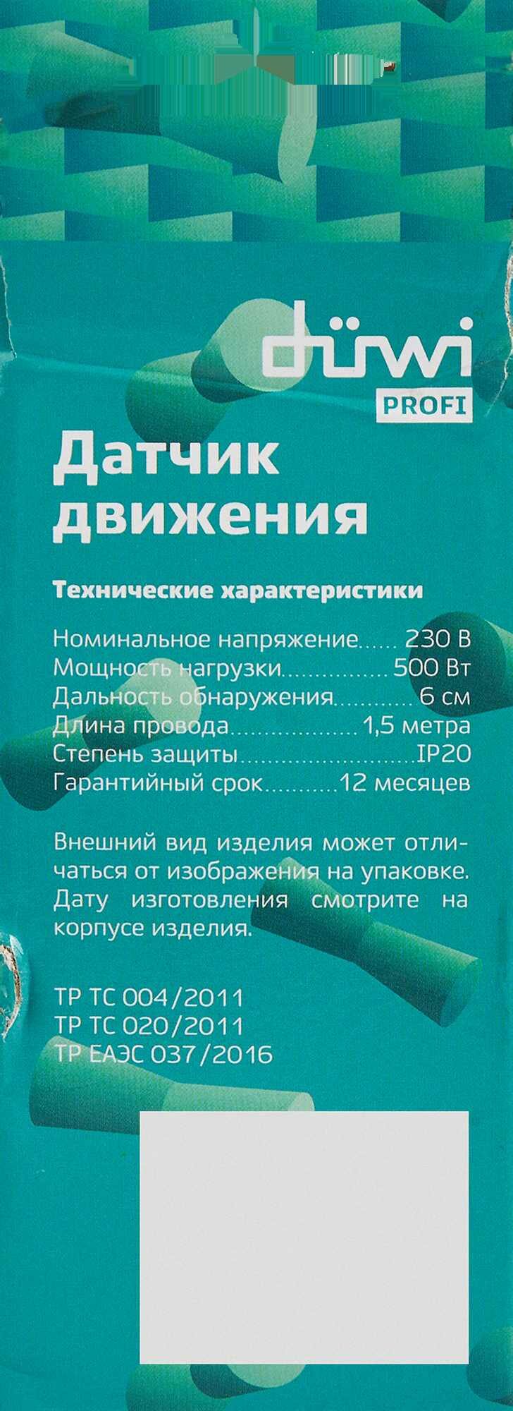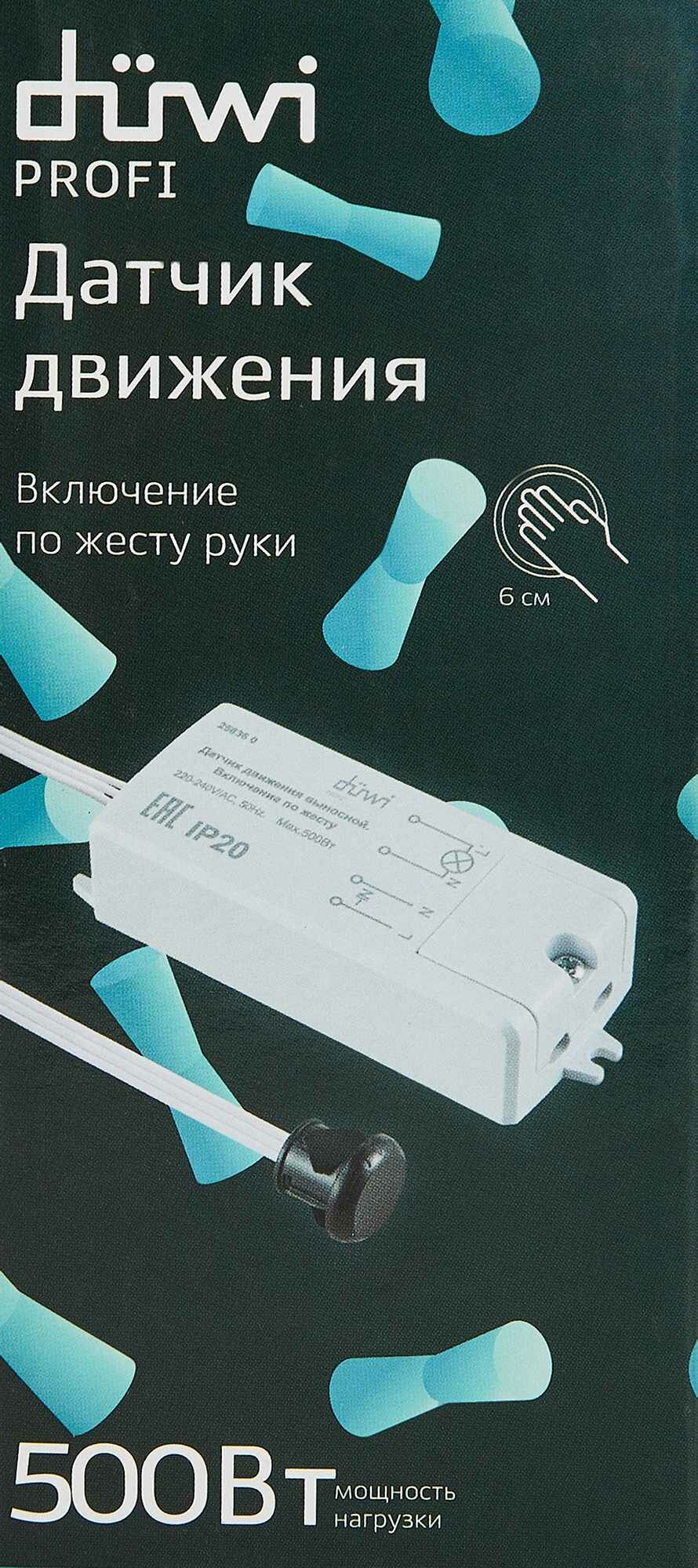 Выносной датчик движения duwi DDSD-1 Short Distance 25836 0 повышает комфорт при пользовании мебелью, закрытыми шкафами.Свет зажигается без нажатия выключателя, что удобно при занятых руках.Выносной тип датчика отлично реагирует на открытие и закрытие дверей.Если забыть выключить свет, перерасхода энергии не произойдет: подсветка погаснет без участия благодаря функции автоматического отключения.Длина провода 1,5 м.Диаметр установочного отверстия 13 мм.