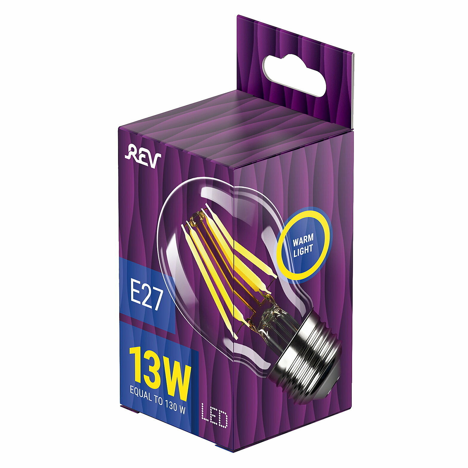 Филаментные светодиодные лампы изготовлены по самой передовой технологии, сочетают в себе привычный внешний вид ламп накаливания и преимущества энергосберегающих светодиодных ламп, обеспечивают значительную экономию электроэнергии и имеют более высокий КПД. Специальная стеклянная колба позволяет использовать филаментные лампы в открытых светильниках, хрустальных люстрах, торшерах и бра. Идеально подходят для различных стилей: Лофт, Авангард, Ретро и др., а также для воплощения смелых идей в освещении. Светодиодные филаментные лампы REV выпускаются в различных формах: изящные свечи (витые, гладкие, изогнутые), шары от 45 до 125 мм, груши, колбы Эдисона, лампы с RGB нитью, а также лампы специальной декоративной серии в виде кристаллов и бриллиантов - на любой вкус и для самых оригинальных дизайнерских решений. В линейке представлены лампы мощностью от 2 до 13W в двух вариантах: теплого в 2700К и редкого прохладного свечения в 4000К. Филаментные лампы REV обладают высокой стабильностью светового потока, отсутствие пульсации создает мягкое, комфортное и безопасное для глаз свечение, особая конструкция обеспечивает широкий угол рассеивания света до 360. Лампа FILAMENT в форме груши, мощностью 13W и цоколем Е27 идеально подойдет для классических рожковых люстр, благодаря равномерному распределению света. Прозрачная колба лампы обеспечит особую игру бликов при использовании в хрустальных и стеклянных люстрах, бра. Теплый свет в 2700 Кельвинов создаёт приятную атмосферу и наполняет помещение уютом.