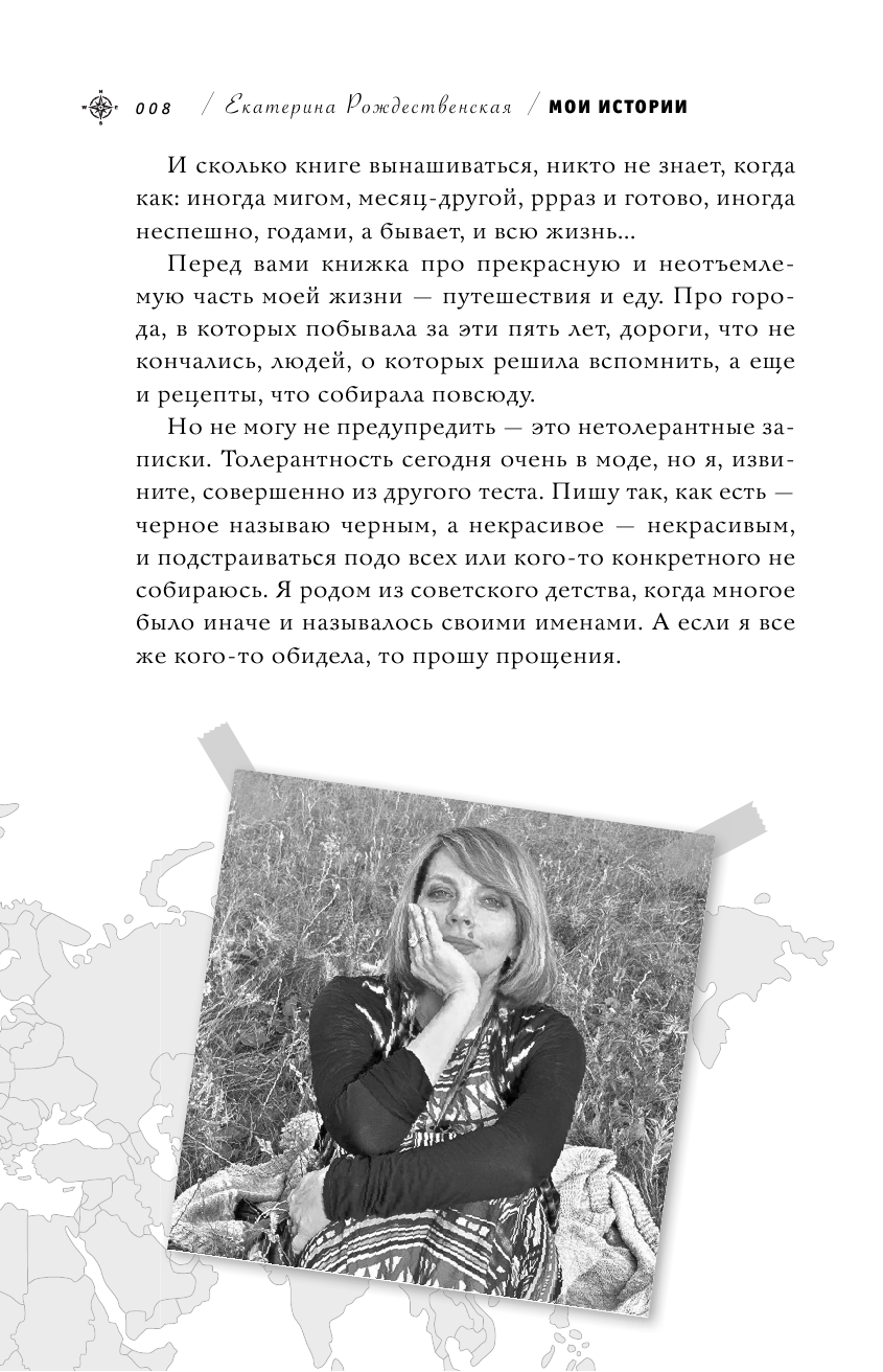 Перед вами книжка про прекрасную и неотъемлемую часть моей жизни - путешествия и еду. Про города, в которых побывала за эти пять лет, дороги, что не кончались, людей, о которых решила вспомнить, а еще и рецепты, что собирала повсюду.