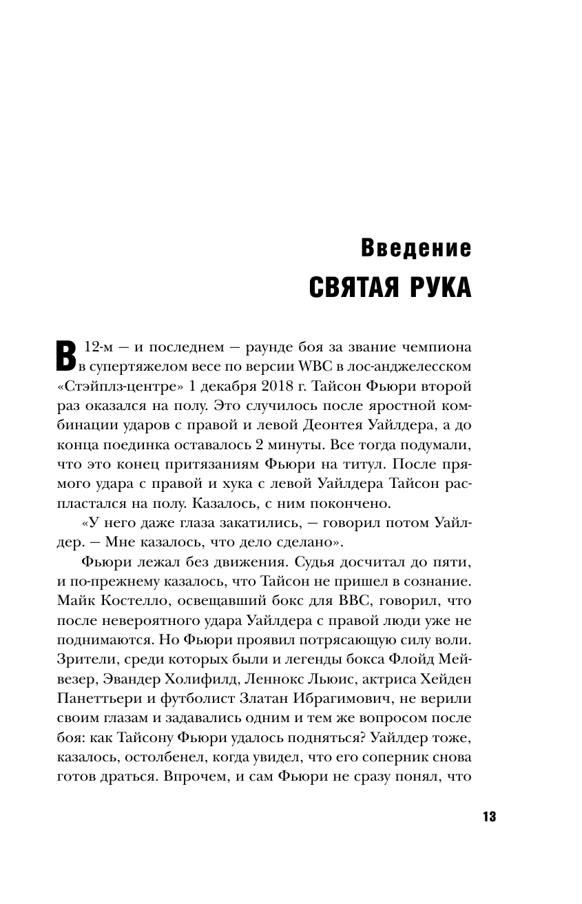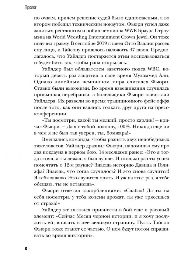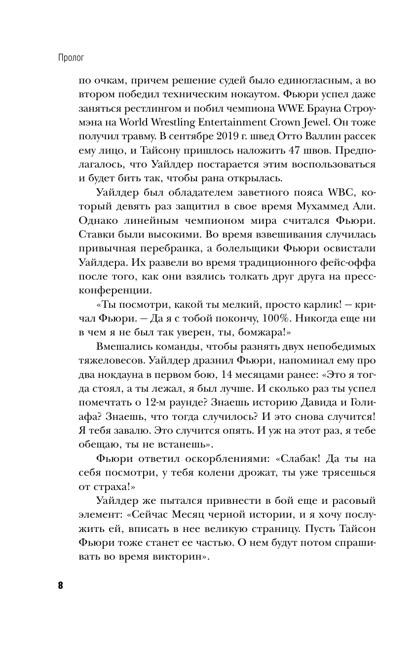 Нормальная книга. Огромный рост 206 см, размах рук, большой вес-настоящий тяжеловес. Молодой, красивый, интересный он открыл новую страницу в тяжелом весе после 11 лет царства братьев Кличко. В 2015г. он победил Вл.Кличко. Далее в 2020 победил самого опаснейшего нокаутера Деонтея Уайлдера на его родине в США и в книге этот интересный эпизод имеется. Двигается Фьюри быстро несмотря на огромные габариты.