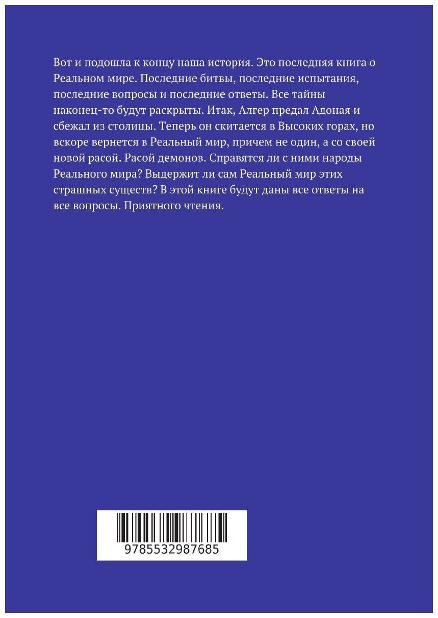 Вот и подошла к концу наша история. Это последняя книга о Реальном мире. Последние битвы, последние испытания, последние вопросы и последние ответы. Все тайны наконец-то будут раскрыты. Итак, Алгер предал Адоная и сбежал из столицы. Теперь он скитается в Высоких горах, но вскоре вернется в Реальный мир, причем не один, а со своей новой расой. Расой демонов. Справятся ли с ними народы Реального мира? Выдержит ли сам Реальный мир этих страшных существ? В этой книге будут даны все ответы на все вопросы. Приятного чтения.