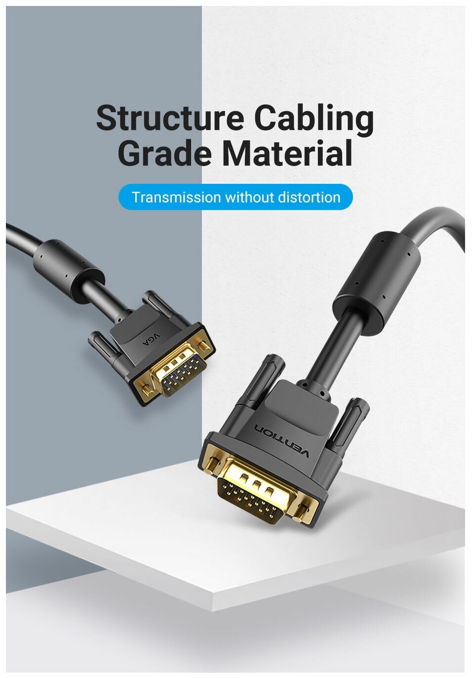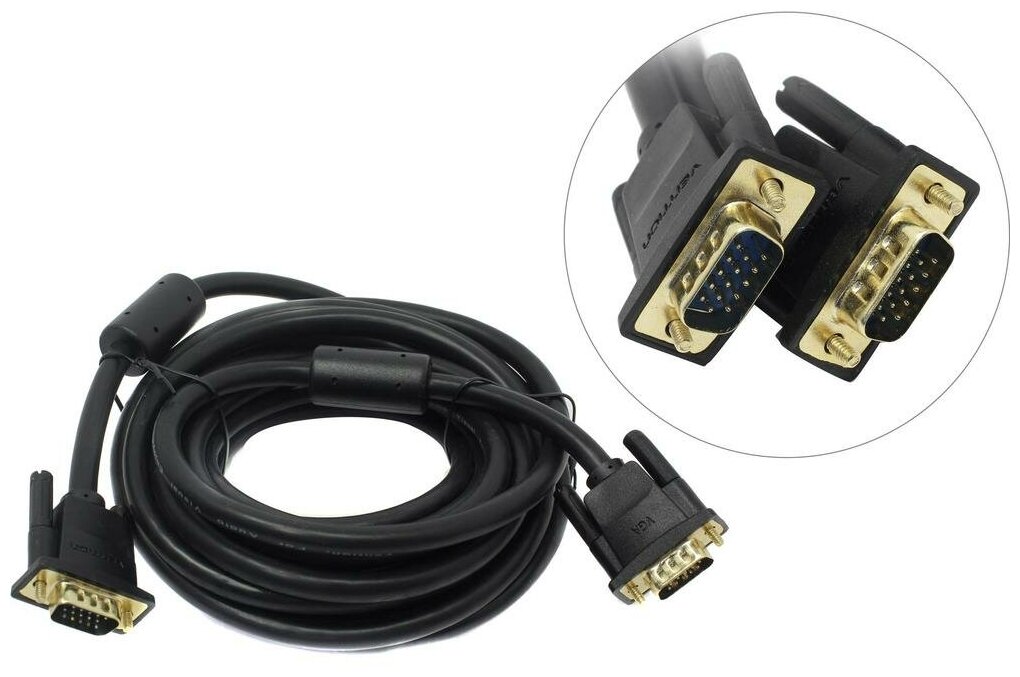 Кабель предназначен для подключения источника аналогового видеосигнала и устройства отображения. Ферритовое кольцо увеличивает индуктивность сигнала проходящего, через этот участок кабеля в несколько сотен/тысяч раз, тем самым обеспечивая подавление помех.