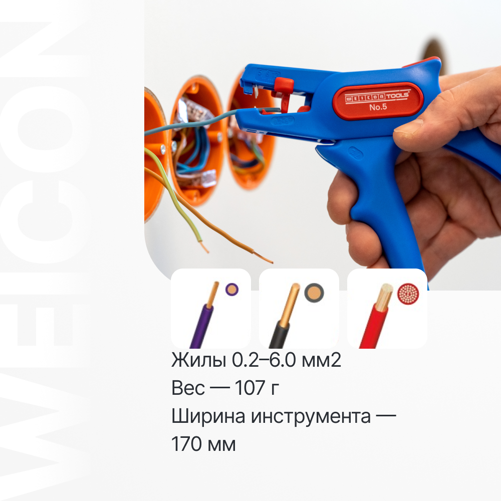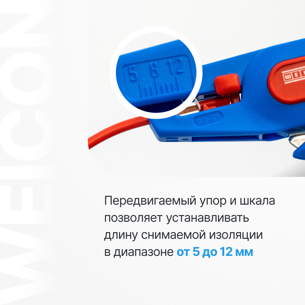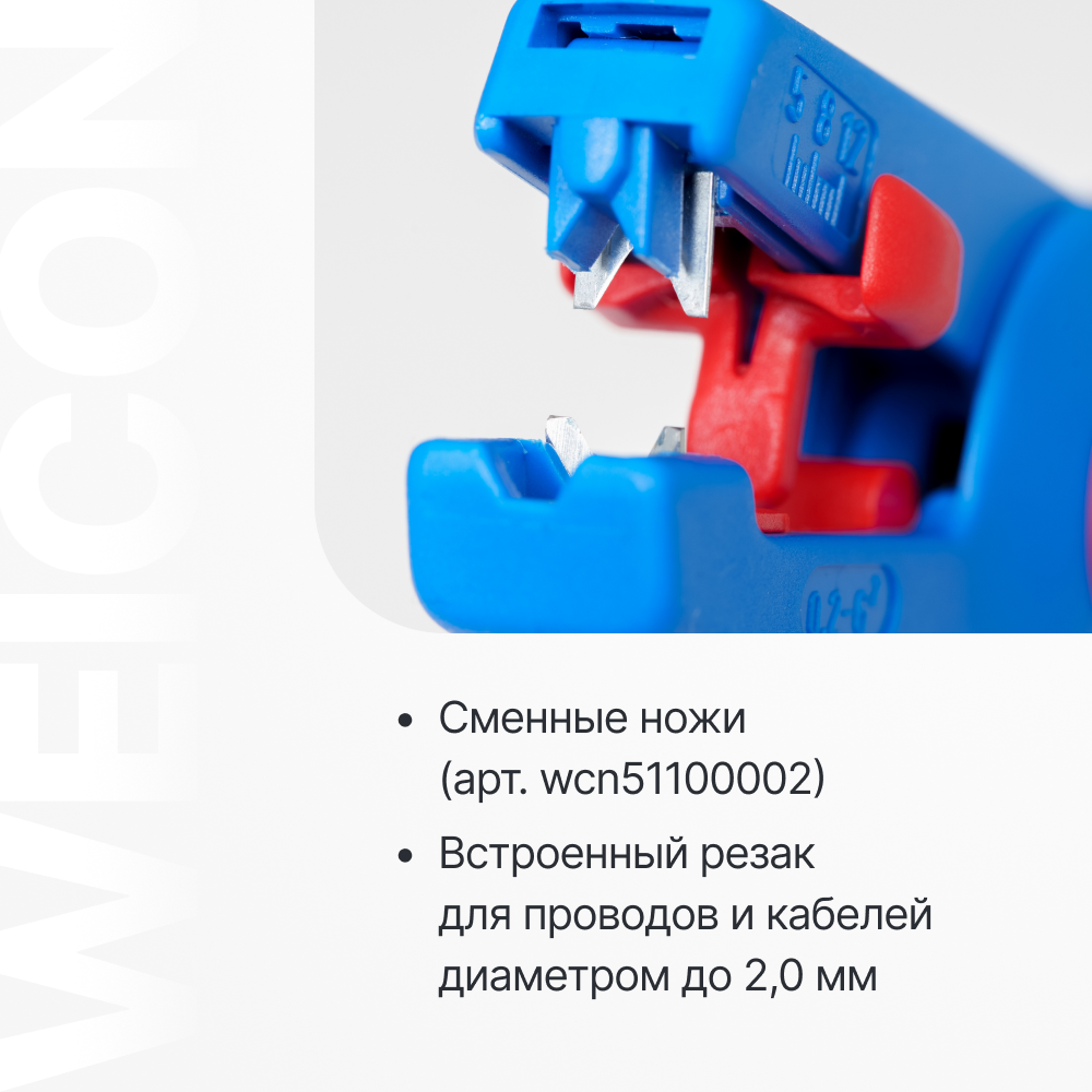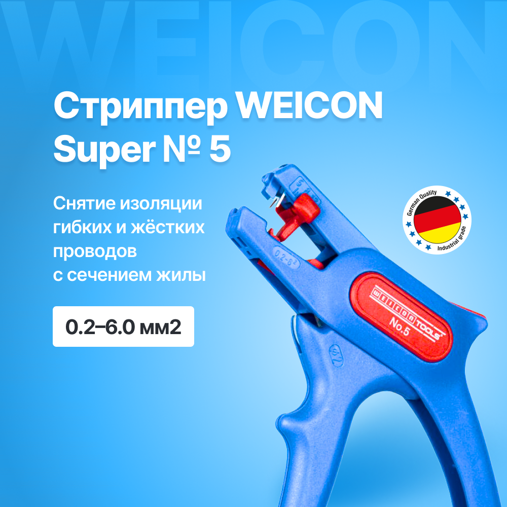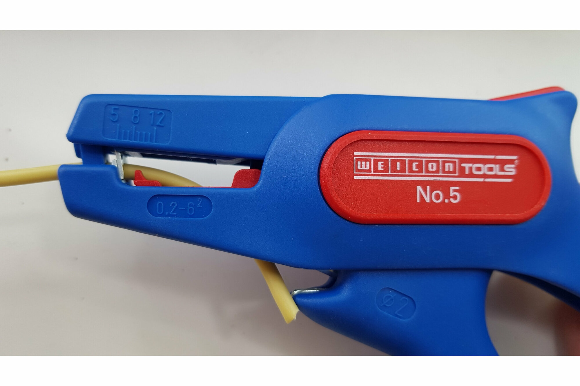 Инструмент для снятия ПВХ-изоляции монтажных проводовЛегкий и удобный в работе стриппер клещевого типа для снятия изоляции гибких и жестких проводов с сечением жилы 0,2-6,0 мм2. Конструкция стриппера обеспечивает автоматическую адаптацию для снятия изоляции проводов с любым сечением жилы из указанного диапазона;Передвигаемый упор и шкала позволяет устанавливать длину снимаемой изоляции в диапазоне от 5 до 12 мм;Ножи стриппера могут быть заменены на новые (арт. wcn51100002 - Комплект зап. ножей для WEICON Super № 5);Встроенный резак для проводов и кабелей диаметром до 2,0 мм.