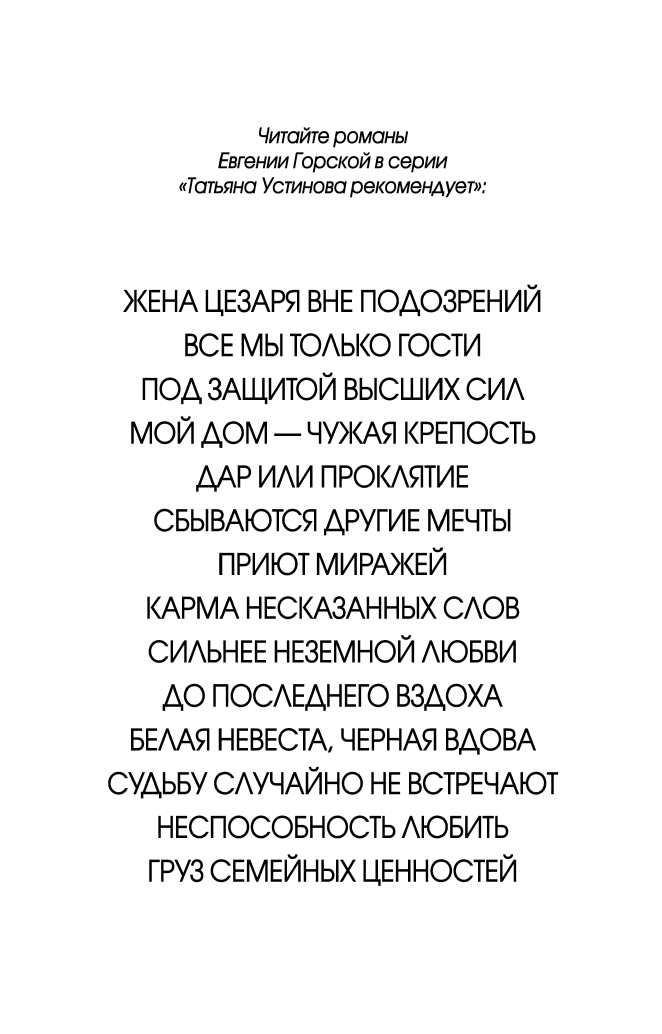 Люблю Горскую. за её героев,за которых хочется переживать,читаешь и не замечаешь ,как проходит время, словно смотришь фильм. просто на одном дыхании. сюжет интересный,герои могу сказать,неоднозначные.. книга всё время держит в напряжении,на протяжении всей книги ,пытаешься угадать ,кто злодей и вроде бы догадался уже, но нет.. в итоге финал все равно удивляет...захватывающе, интересно,увлекательно. рекомендую к прочтению.