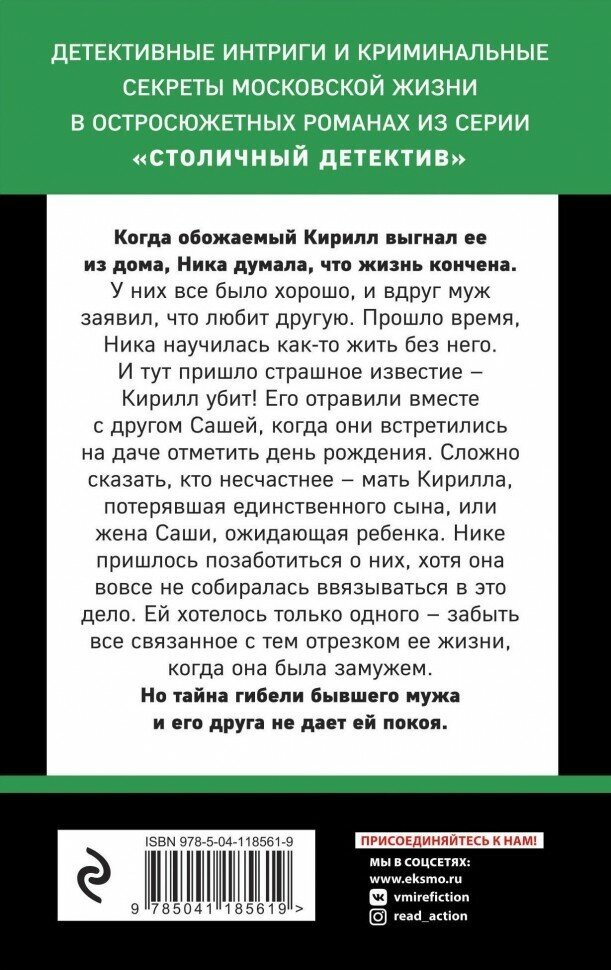 Когда обожаемый Кирилл выгнал ее из дома, Ника думала, что жизнь кончена. У них все было хорошо, и вдруг муж заявил, что любит другую. Прошло время, Ника научилась как-то жить без него. И тут пришло страшное известие — Кирилл убит! Его отравили вместе с другом Сашей, когда они встретились на даче отметить день рождения. Сложно сказать, кто несчастнее — мать Кирилла, потерявшая единственного сына, или жена Саши, ожидающая ребенка. Нике пришлось позаботиться о них, хотя она вовсе не собиралась ввязываться в это дело. Ей хотелось только одного — забыть все связанное с тем отрезком ее жизни, когда она была замужем. Но тайна гибели бывшего мужа и его друга не дает ей покоя.