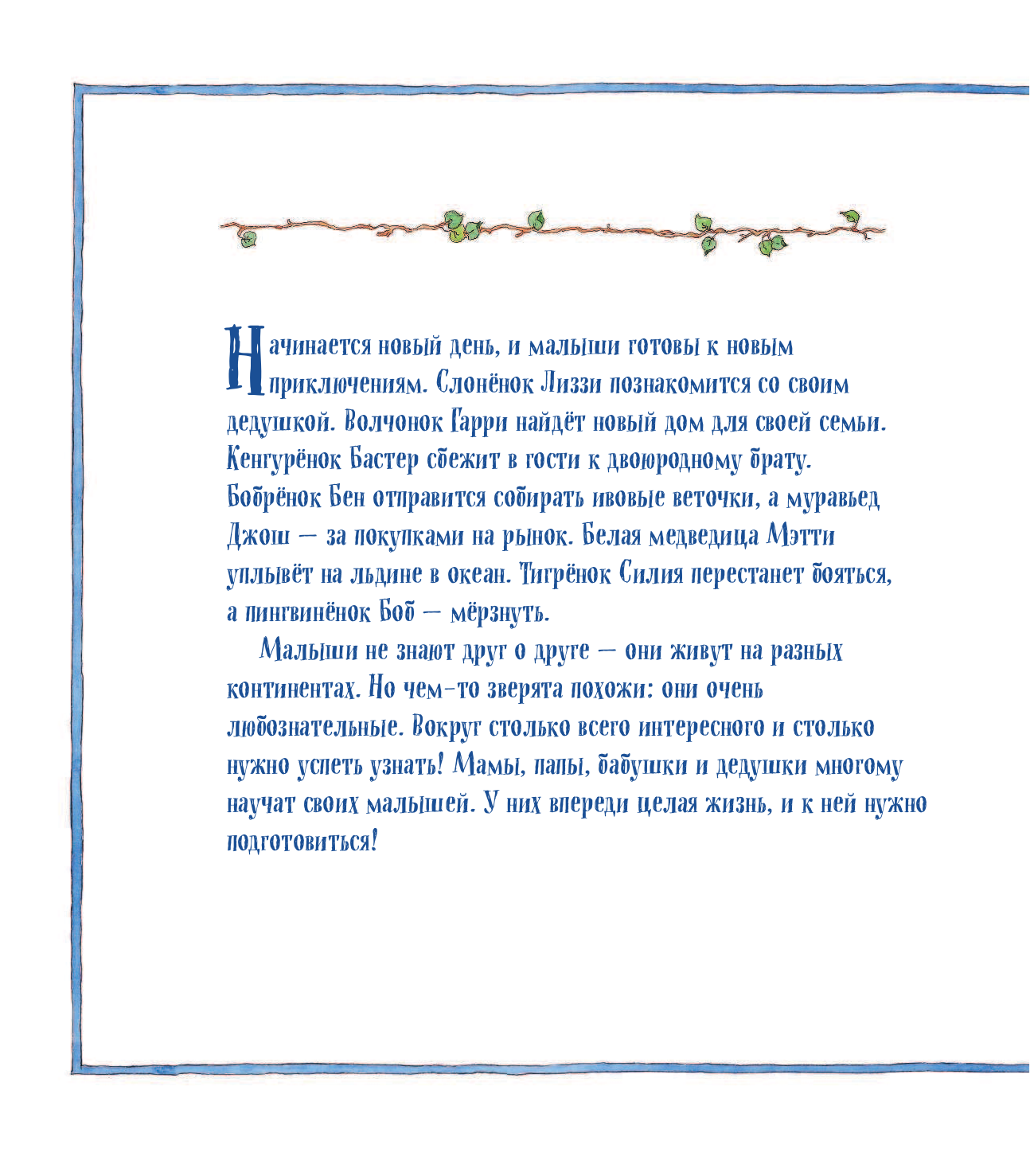 Где-то на других континентах тоже живут зверята-малыши. В Африке - слонёнок, в Австралии - кенгурёнок, в Арктике - белый медвежонок, в Антарктиде - пингвинёнок, в Европе - волчонок, в Северной Америке - бобрёнок, в Южной Америке - маленький муравьед. И с каждым из них произойдёт удивительная история.