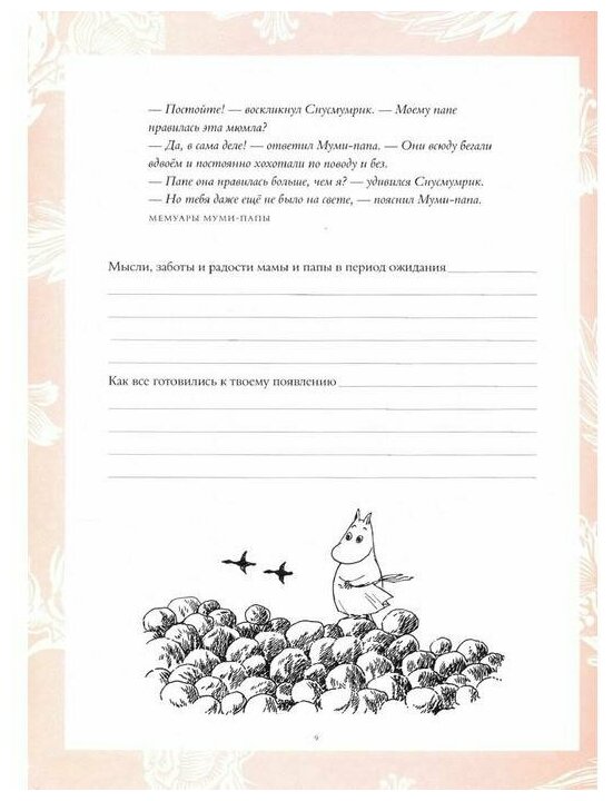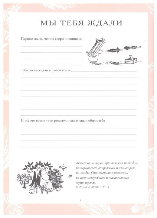 Книга очень красиво и стильно оформлена в нежные тона, от неё так и веет теплом и уютом. Отлично пойдёт на подарок новорождённому не ленивым родителям, потому что альбом предлагается активно заполнять. Зато мы получим полную хронику первых лет жизни вплоть до школы. На самом деле для ребёнка это будет очень интересным в будущем, не говоря уже о том, что будет видно, с какой любовью заполнялся альбом, так ещё очень много всего ребёнок сможет о себе узнать... Кроме того на каждой странице любимые и знакомые всём жители Муми-дола