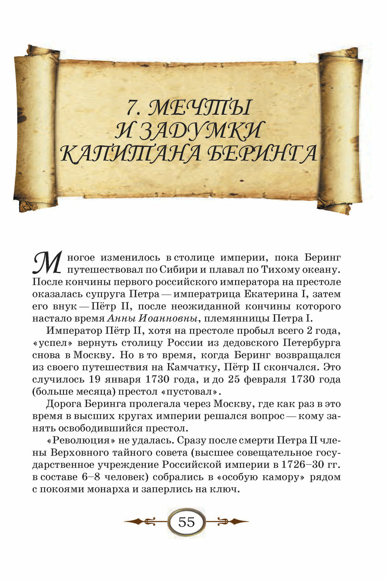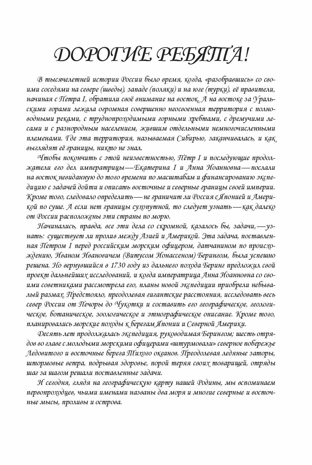 Предлагаемая читателю книга повествует о подвигах русских моряков-исследователей XVIII века, открывших и впервые описавших морские берега России на Крайнем Севере и Дальнем Востоке. Читатель узнает, как целая эпопея открытий была начата датчанином на русской службе капитаном Витусом Берингом, отправившимся по воле Петра I на поиски пролива, отделяющего российскую землю от американского материка. Экспедиция заняла долгие 10 лет. В результате были исследованы берега Ямала, Таймыра и Камчатки, открыты Курильские острова, а также "закрыты" земля "Жуана де Гама", "Кампании" и земля "Еззо". Вы узнаете о драматическом походе двух русских кораблей, возглавляемых капитан-командором В. Берингом и капитан-лейтенантом А. Чириковым к берегам Америки. Книга будет интересна и полезна всем любителям истории географических открытий.