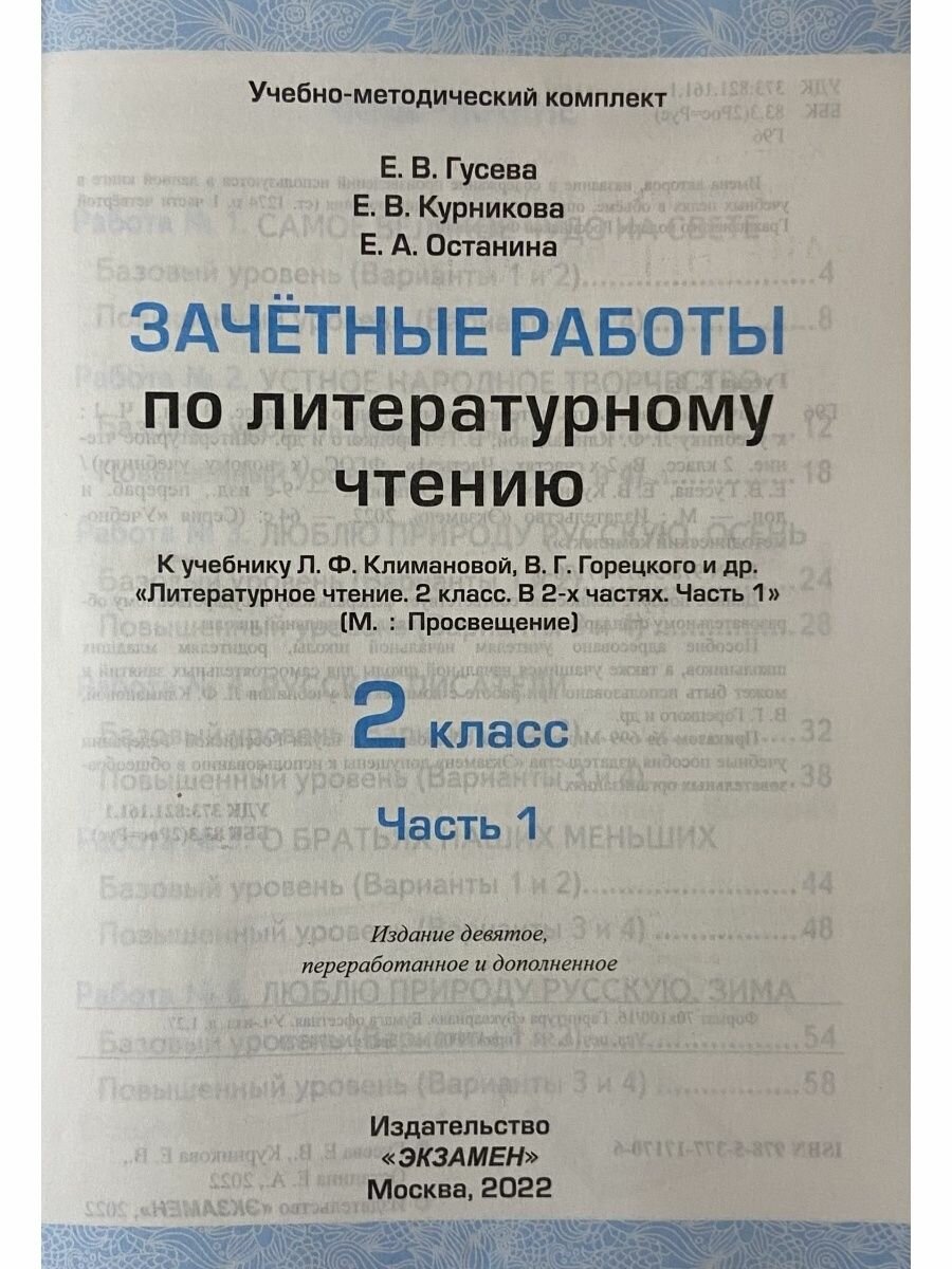 Литературное чтение. 2 класс. Зачётные работы к учебнику Л Ф. Климановой. В 2-х частях. Часть 1 (Гусева Екатерина Валерьевна, Курникова Елена Владимировна, Останина Евгения Андреевна); Экзамен, 2022