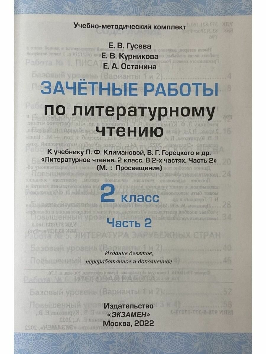 Литературное чтение. 2 класс. Зачётные работы к учебнику Л Ф. Климановой. В 2-х частях. Часть 2 (Гусева Екатерина Валерьевна, Курникова Елена Владимировна, Останина Евгения Андреевна); Экзамен, 2022