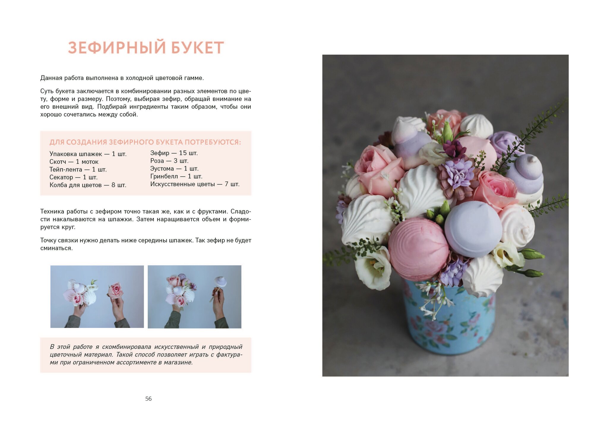 В книге много рецептов и у каждого свой список необходимых составляющих. Есть букет из сухофруктов, зефира. Фруктовые букеты. Конечно, хотелось что бы больше было информации по новогодней флористике, но как собрать венок я теперь уже знаю)