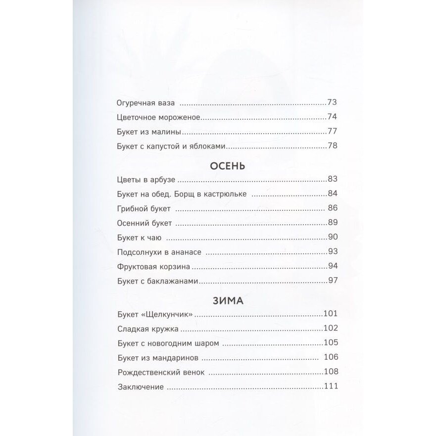 Необычно! Давно искала толковую литературу по фруктовой флористике на русском, и эта книга открыла мне новые дали. Круто, что есть разделы по сезонам, не запутаешься. Ещё понравилась идея ореховых букетов, выглядят очень эстетично. Советую всем, кто хочет попробовать сделать оригинальный подарок или украшение для стола.