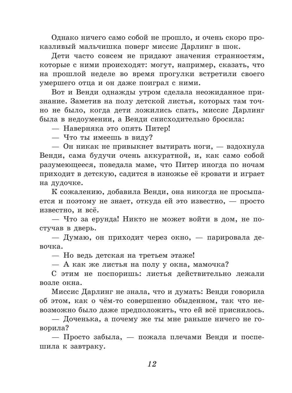 Начала читать эту книгу после "Тысячи ночей у открытого окна". В жизни и литературе часто встречаются отсылы к этой сказке. Я решила восполнить пробел: в детстве я как-то прошла мимо Питера. Легкая атмосфера, погружение в детство. Это приятно. Но, наверно, это надо было прочесть в детстве. Сейчас бросались в глаза недостатки сказочного мальчика, от этого он казался недостаточно сказочным. Но рассудила, что в жизни мы все тоже чёрно-белые, смирилась ))). Концовка очень понравилась - в отличие от американских хэппи-эндов она учит жизни. Спасибо сайту за знакомство с мальчиком Питером и Венди!