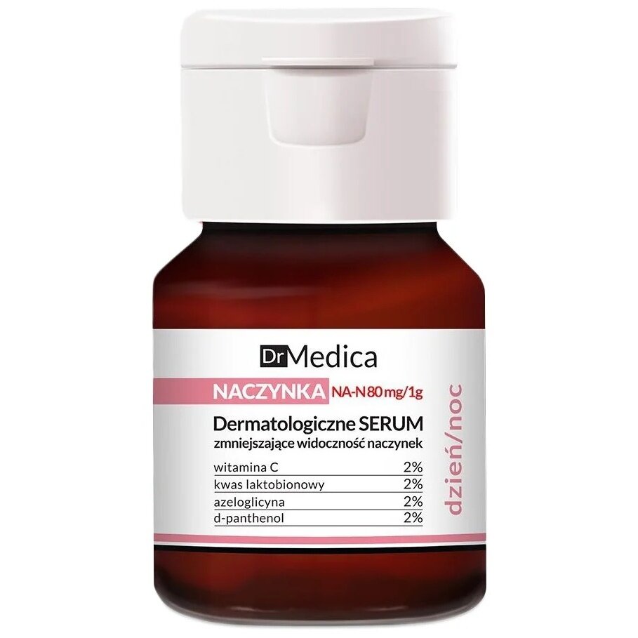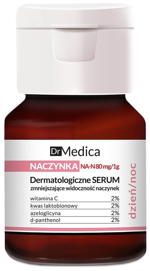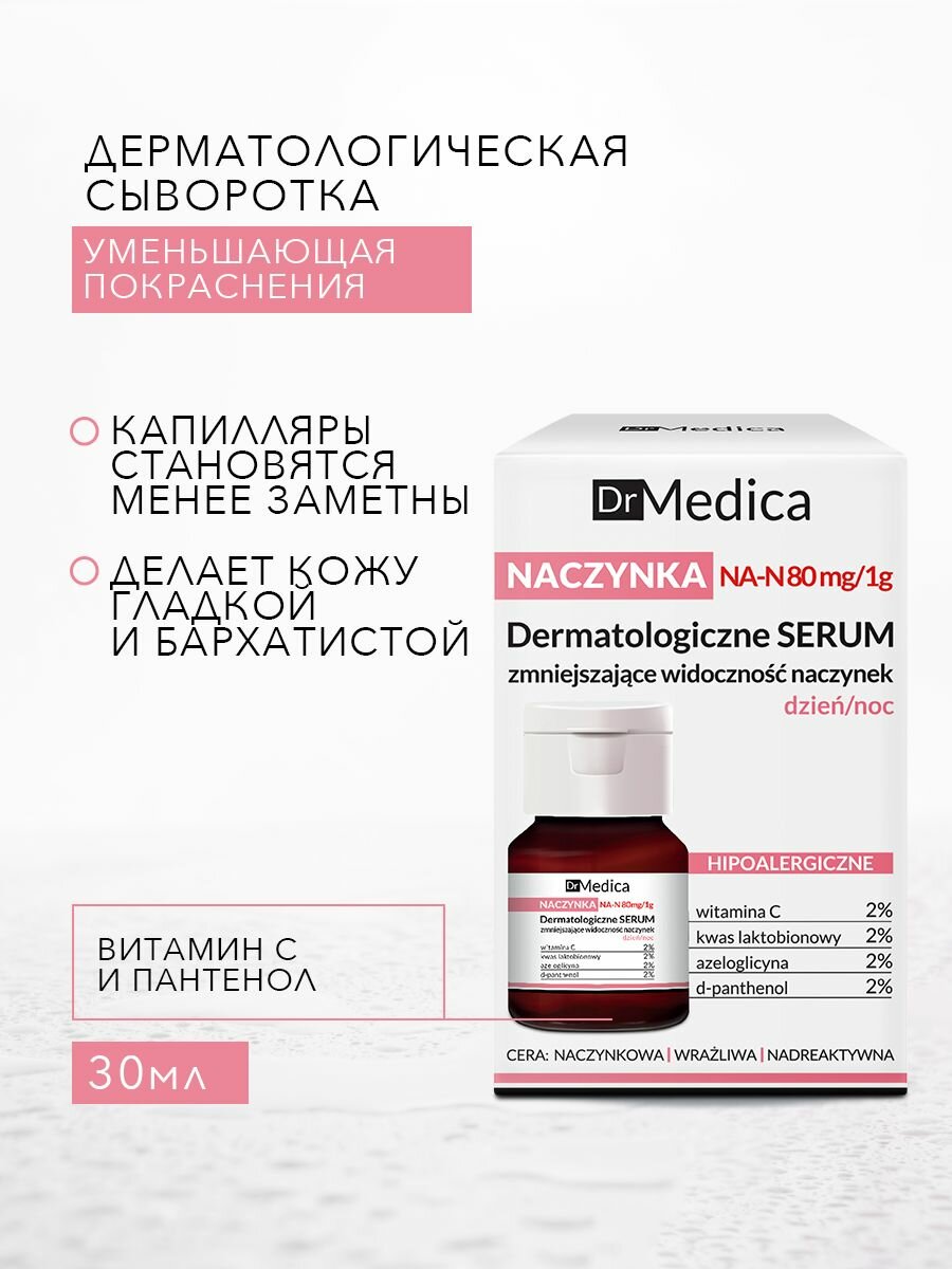 Для чувствительной кожи с куперозом. Дерматологическая сыворотка без запаха, уменьшающая видимость капилляров содержит специально разработанную формулу NA-N 80 mg/1g, которая состоит из активных ингредиентов, действующих целенаправленно на заметные куперозные изменения. Препарат эффективно уменьшает видимость капилляров, осветляет пигментные изменения, возвращает ровный цвет и сияние, укрепляет эластичность кровеносных сосудов, повышая их прочность, уменьшает покраснения кожи, противодействует образованию новых „звездочек”, снимает раздражения, снижает чувствительность кожи. применение: Сыворотку нанести на очищенную кожу лица. Избегать области вокруг глаз. Использовать ежедневно отдельно или в качестве основы под крем. При использовании днем защитить кожу от ультрафиолетового излучения.