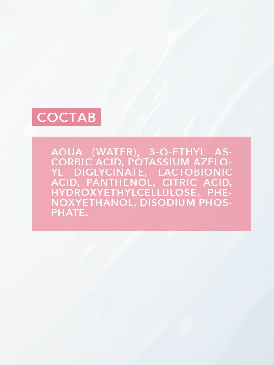 | Состав | Aqua (Water), Potassium Azeloyl Diglycinate, Mandelic Acid, Niacinamide, Sodium Hyaluronate, Allantoin, Panthenol, Hydroxyethylcellulose, Polysorbate 20, Ethylhexylglycerin, Phenoxyethanol, Parfum (Fragrance), Linalool |