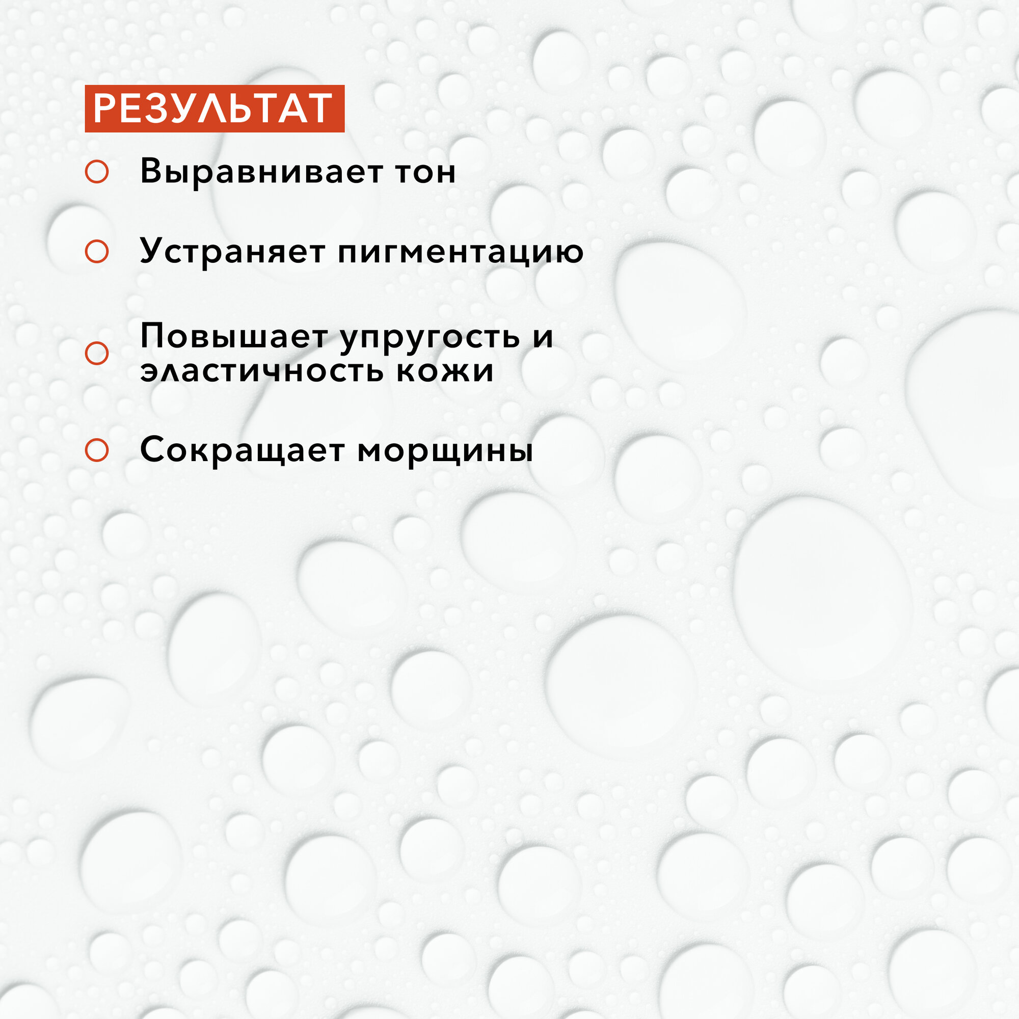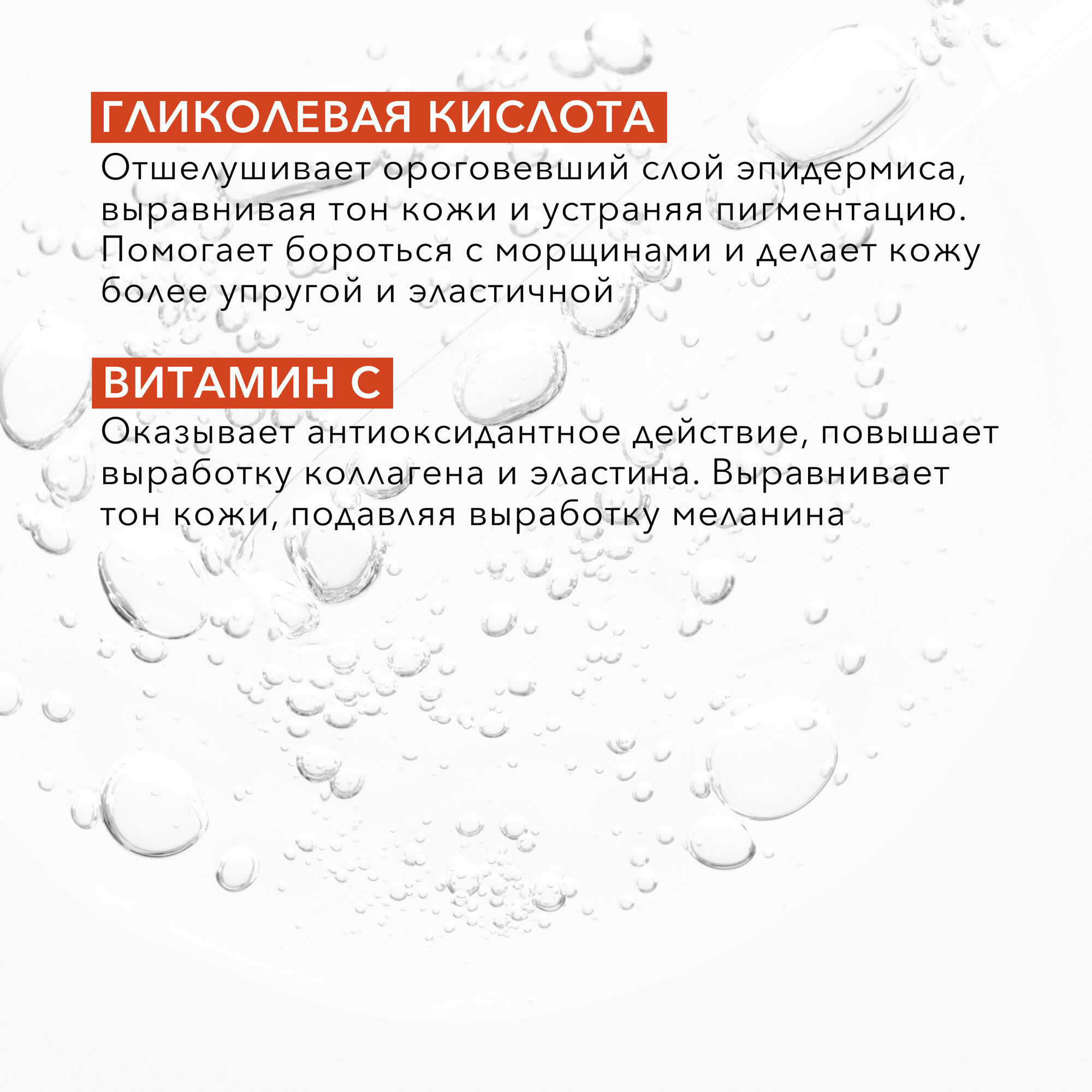 Сыворотка эффективно повышает качество и состояние кожи. Благодаря содержанию кликолевой кислоты и 100% стабилизированного витамина С продукт гарантирует двойное современное отшелушивание, в результате чего кожа полностью восстанавливается и обновляется, разглаживаются морщины и уменьшается пигментация.