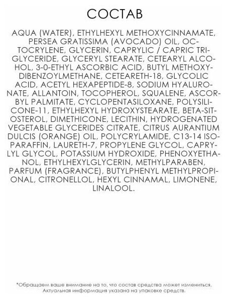 | Состав | Aqua (Water), Ethylhexyl Methoxycinnamate, Persea Gratissima (Avocado) Oil, Octocrylene, Glycerin, Caprylic / Capric Triglyceride, Glyceryl Stearate, Cetearyl Alcohol, 3-0-Ethyl Ascorbic Acid, Butyl Methoxydibenzoylmethane, Ceteareth-18, Glycolic Acid, Acetyl Hexapeptide-8, Sodium Hyaluronate, Allantoin, Tocopherol, Squalene, Ascorbyl Palmitate, Cyclopentasiloxane, Polysilicone-11, Ethylhexyl Hydroxystearate, Beta-Sitosterol, Dimethicone, Lecithin, Hydrogenated Vegetable Glycerides Citrate, Citrus Aurantium Dulcis (Orange) Oil, Polycrylamide, C13-14 Isoparaffin, Laureth-7, Propylene Glycol, Caprylyl Glycol, Potassium Hydroxide, Phenoxyethanol, Ethylhexylglycerin, Methylparaben, Parfum (Fragrance), Butylphenyl Methylpropional, Citronellol, Hexyl Cinnamal, Limonene, Linalool. |