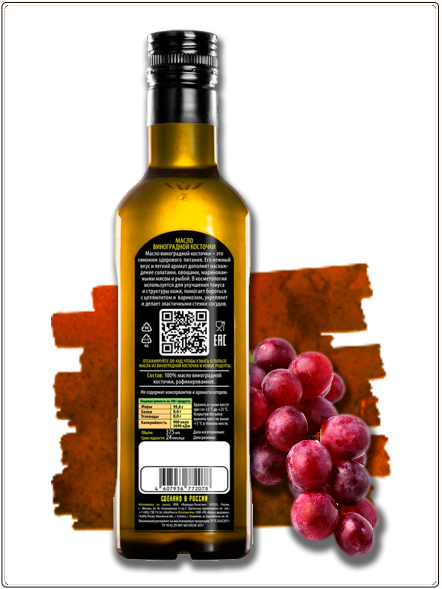 | Состав | 100% масло виноградной косточки, рафинированное. |