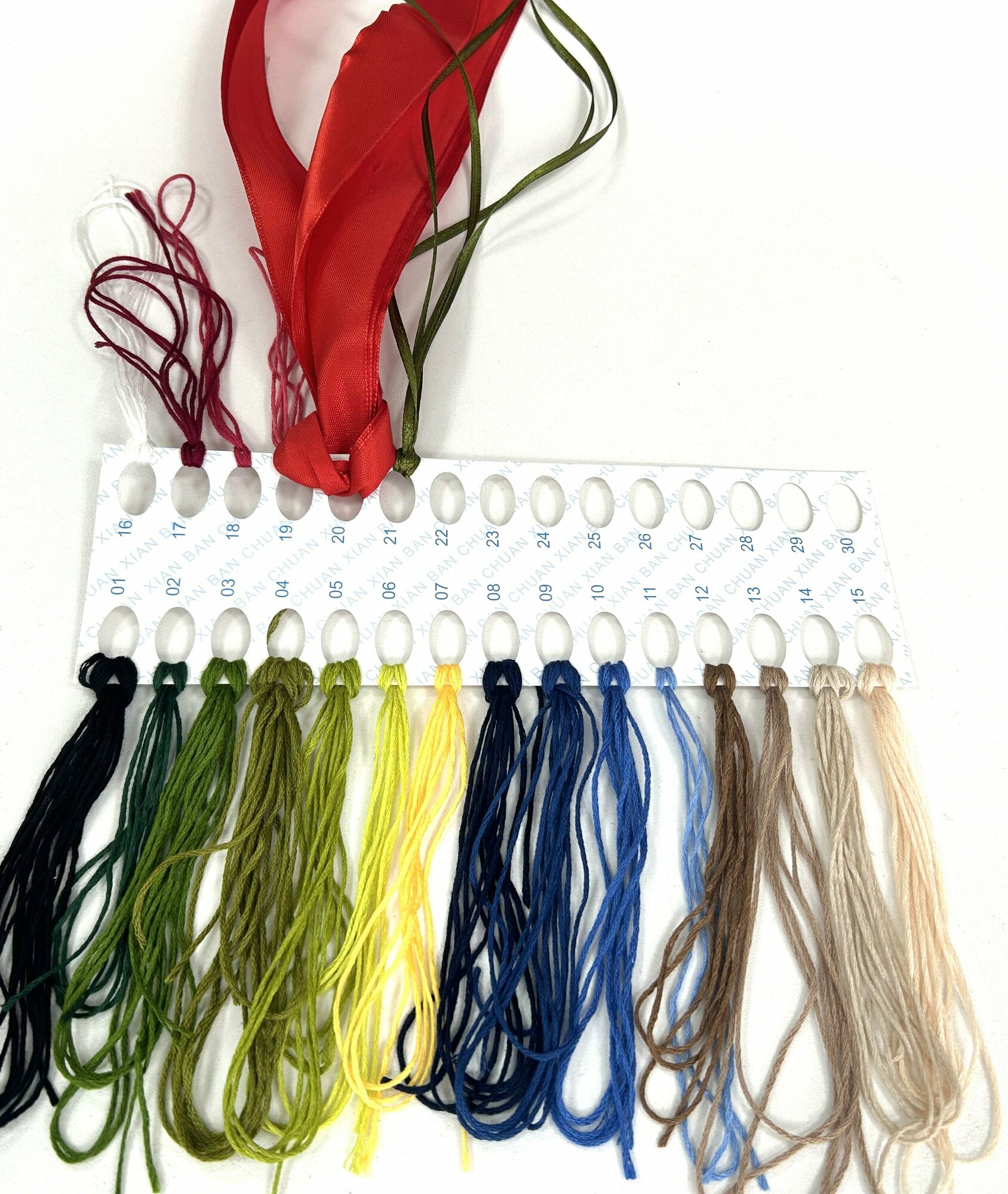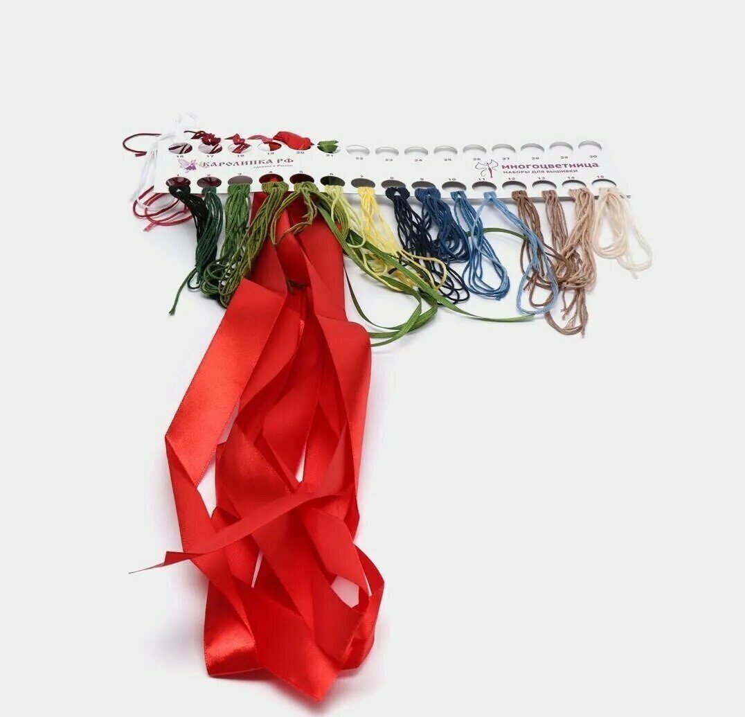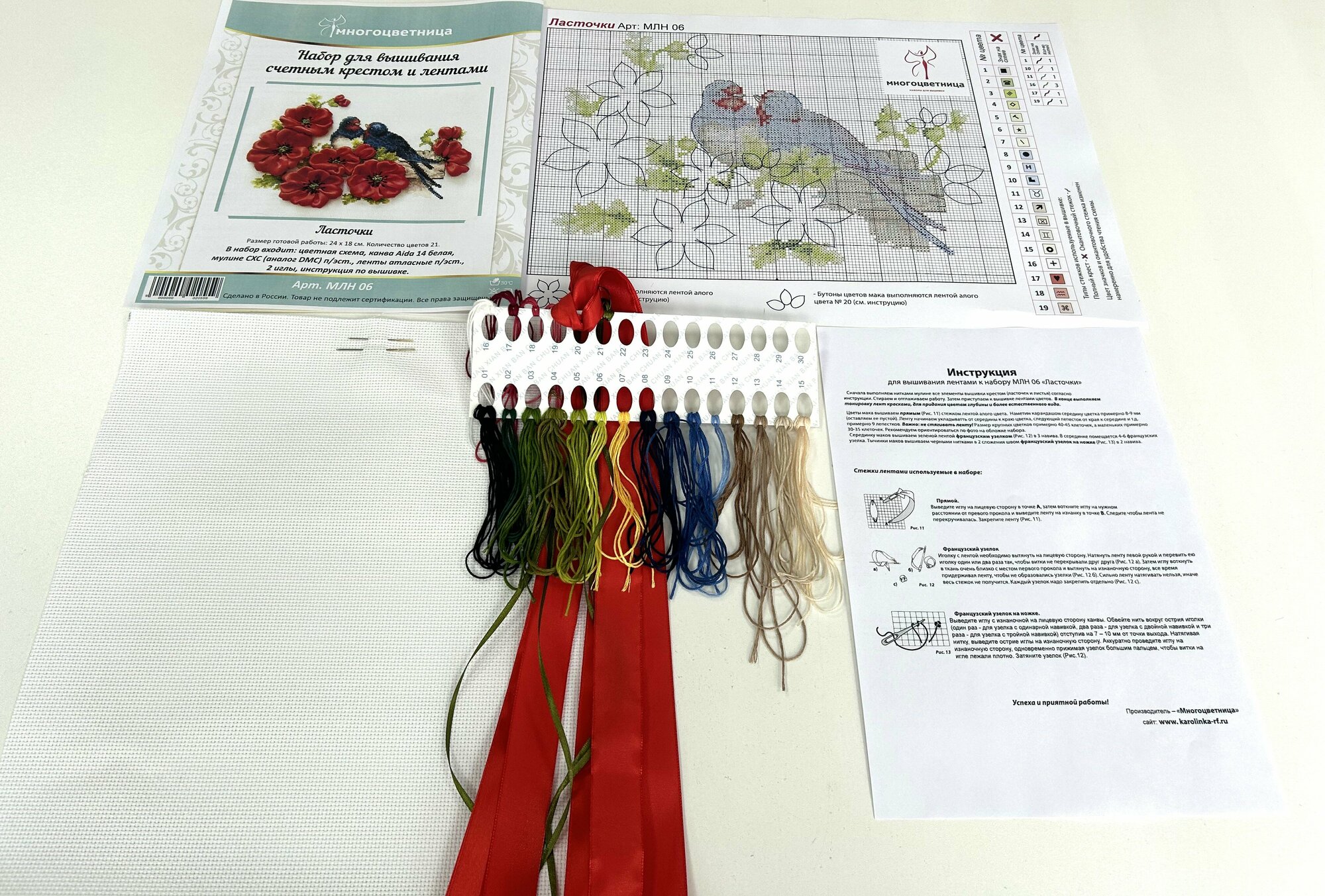 | Комплектация | Канва Aida 14 белая; Ленты атласные 100% полиэстер; Мулине СХС (аналог DMC); 2 иглы; схема на бумаге; Инструкция по вышивке |