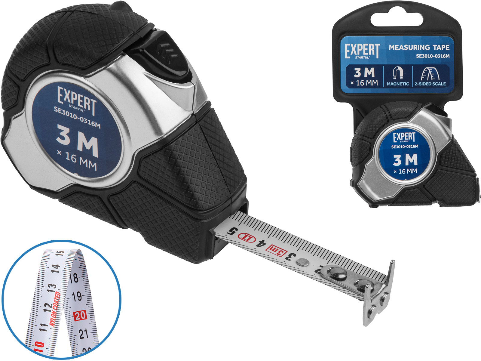 Рулетка строительная 3 м 16 мм с автостопом и магнитом STARTUL Expert имеет двустороннюю шкалу нанесения и магнитный наконечник. Корпус изготовлен из ударопрочного пластика и имеет ударогасящие резиновые накладки. Инерционный тормоз защищает концевой участок измерительной ленты. Удобная скоба позволяет крепить рулетку на ремень. Ремешок из полиамида позволяет зафиксировать рулетку на запястье руки. Особенности: 3-слойное полимерное покрытие, наружный слой износостойкий прозрачный нейлон, что существенно увеличивает ресурс работы измерительной ленты и обеспечивает защиту от выцветания под воздействием УФ лучей.