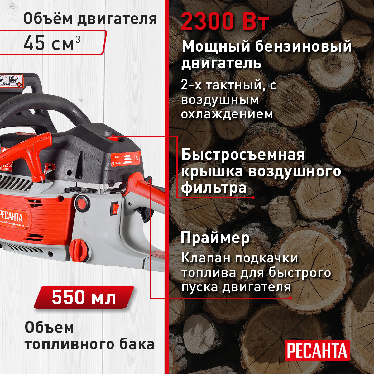 Бензопила Ресанта – легкий и надежный инструмент для дачи и небольшого загородного строительства. Пила укомплектована двигателем на 2,3 л.с.и 45 сантиметровой шиной для заготовки дров и подрезки небольших деревьев. Автоматический тормоз цепи и щиток для рук обеспечивают безопасность. Воздушный фильтр защищен специальным кожухом, который легко открывается с помощью специального поворотного колесика. Рукоятка бензопилы Ресанта имеет удобную для захвата форму. Расширенная нижняя часть рукоятки - для защиты руки при разрыве цепи. Объем бака в 0,55 литра хватает на долгую работу без дозаправки. В полной комплектации пила весит 7 кг.