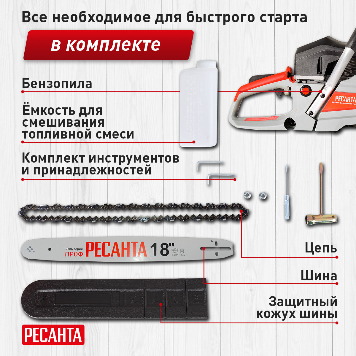 | Комплектация | Бензопила - 1 шт.; Шина - 1 шт.; Цепь - 1 шт.; Защитный кожух шины - 1 шт.; Ёмкость для смешивания топливной смеси - 1 шт.; Паспорт продукции - 1 шт.; Комплект инструментов и принадлежностей - 1 шт.; Упаковка |