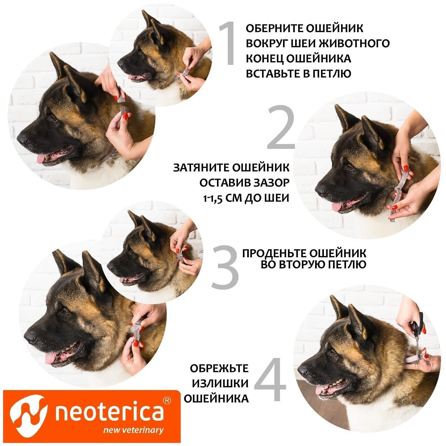 После вскрытия упаковки ошейник разворачивают и одевают на животное, подгоняя по размеру так, чтобы между шеей животного и ошейником оставался промежуток в 1 - 1,5 см, затем закрепляют фиксатором, излишек ленты срезают.