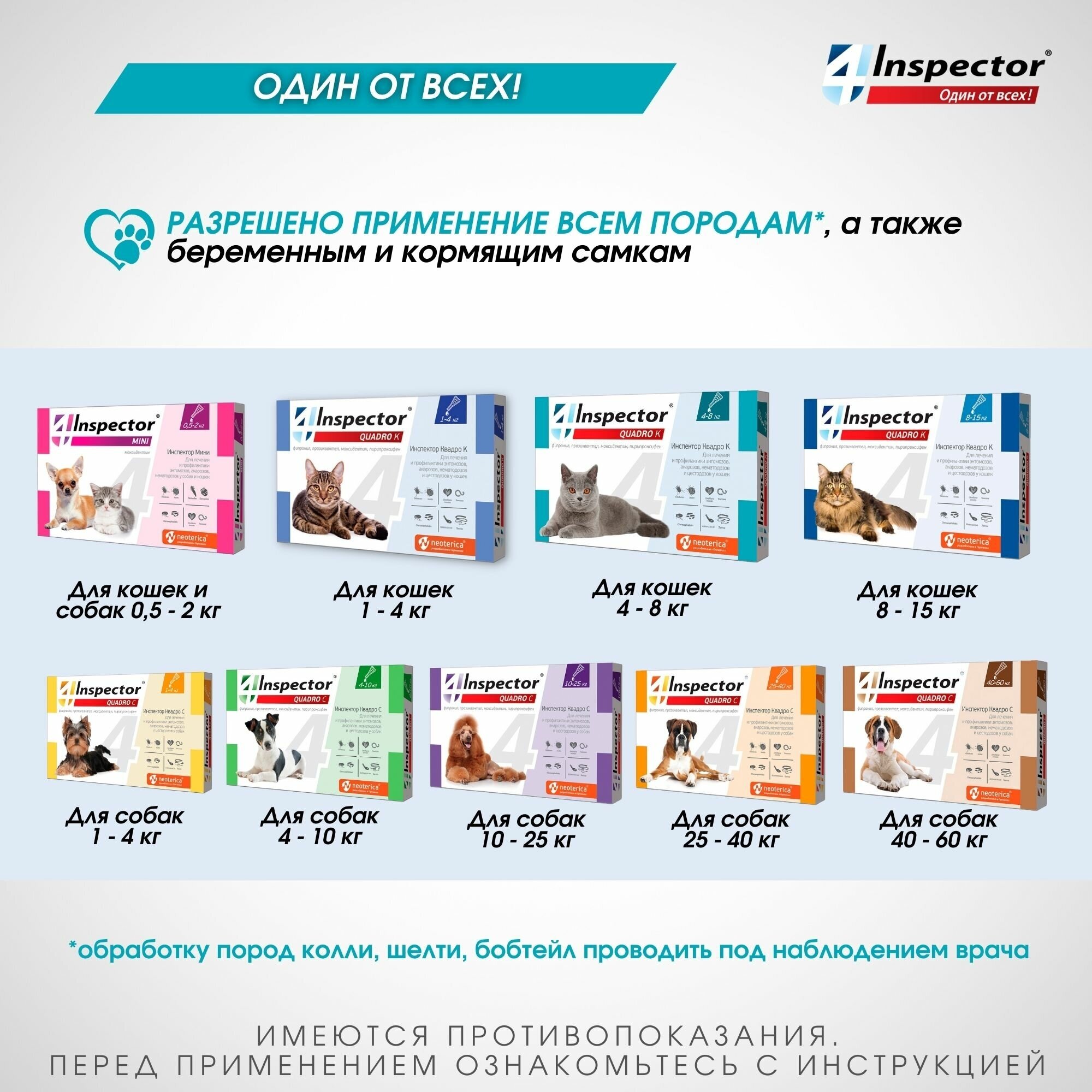 Inspector Quadro – один от всех! Комплексный препарат против 20 видов наружных и внутренних паразитов.