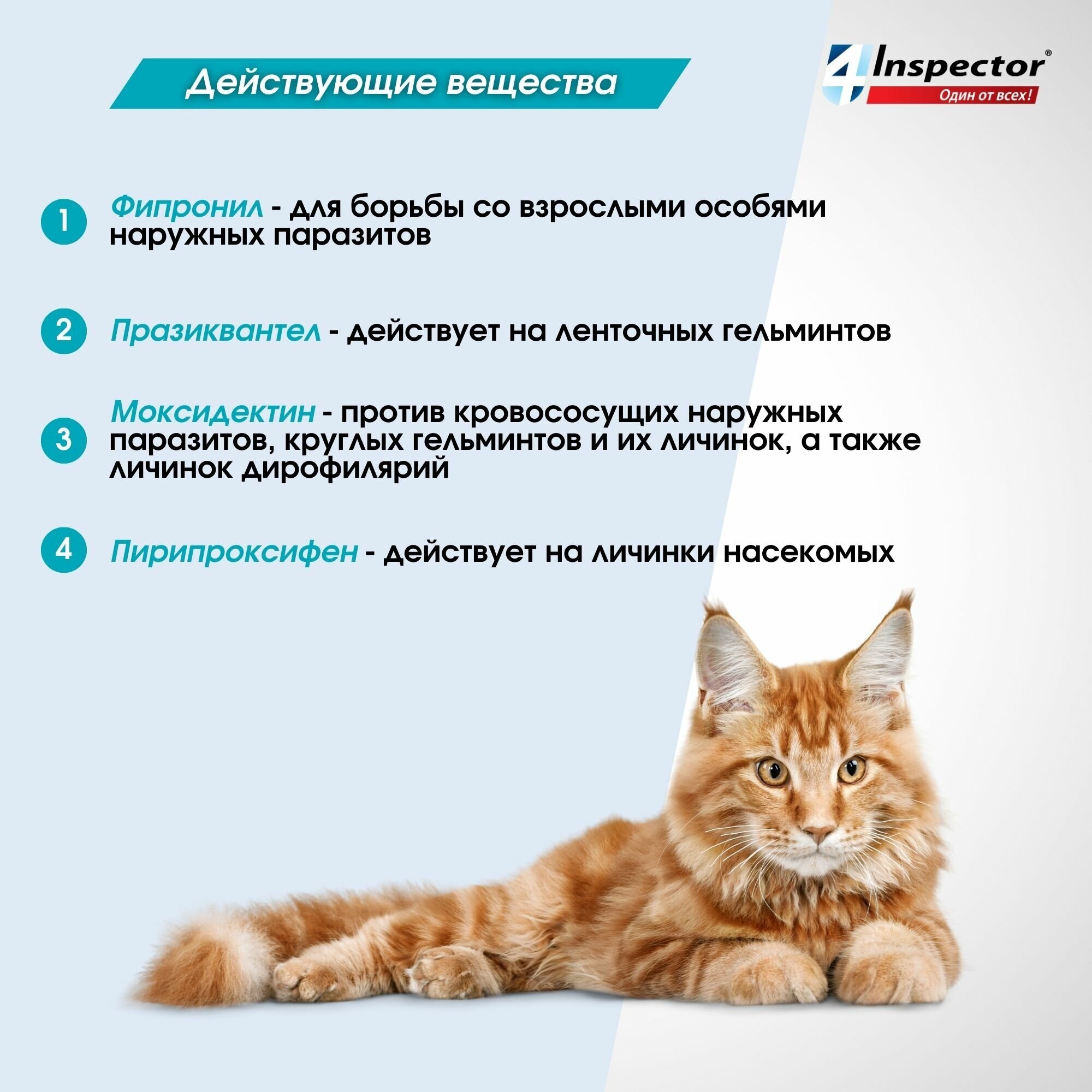 | Действующее вещество | Моксидектин / Пирипроксифен / Празиквантел / Фипронил |