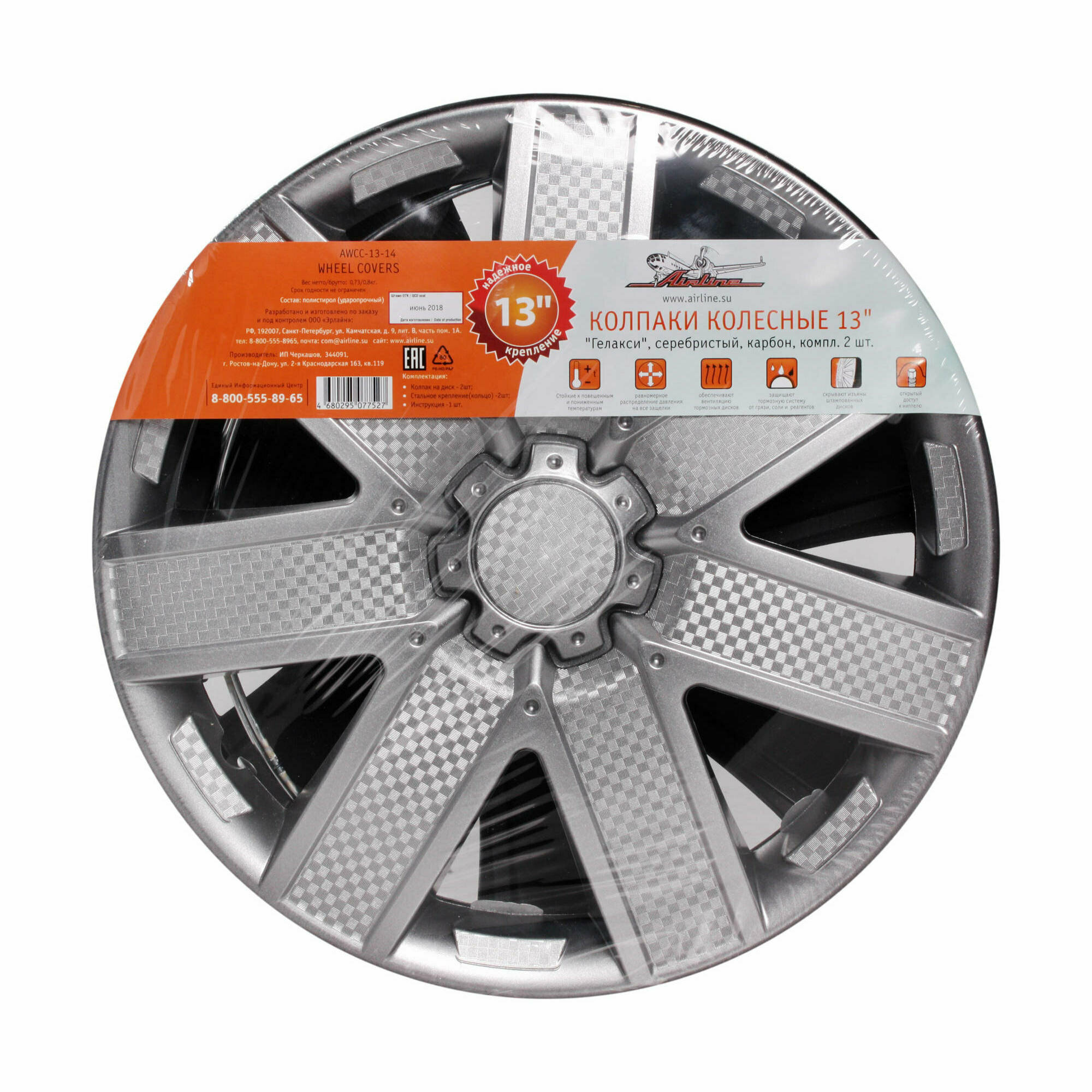 Колпаки колесные 13" "Гелакси", серебристый, карбон, компл. 2 шт.Описание:Колпаки изготовлены из ударопрочного полистирола, имеют модную текстуру имитирующую карбон и покрашены в популярные цвета. Снабжены надежными универсальными креплениями позволяющие обеспечивать равномерное распределение давления на все защелки. Колпаки AIRLINE защитят тормозную систему от грязи и скроют изъяны штампованных дисков, тем самым украсив ваш автомобиль. Преимущества: универсальное крепление обеспечивает равномерное распределение давления на все защелки стойкие к повышенным и пониженным температурам скрывают изъяны штампованных дисков защищают тормозную систему от попадания грязи, соли и реагентов не припятствуют вентиляции тормозных дисков открытый доступ к ниппелю.Характеристики:Артикул: AWCC-13-14Состав: полистирол (ударопрочный)Цвет: серебристыйТип крепления: Защелки+ металл. обручДиаметр (дюйм): 13 Комплектация: Колпак-2 шт.Крепление(кольцо)-2 шт.Инструкция-1 шт.Гарантия: от 1 года.