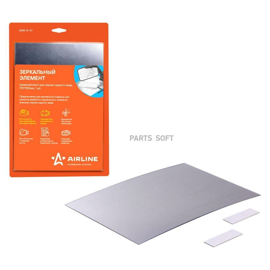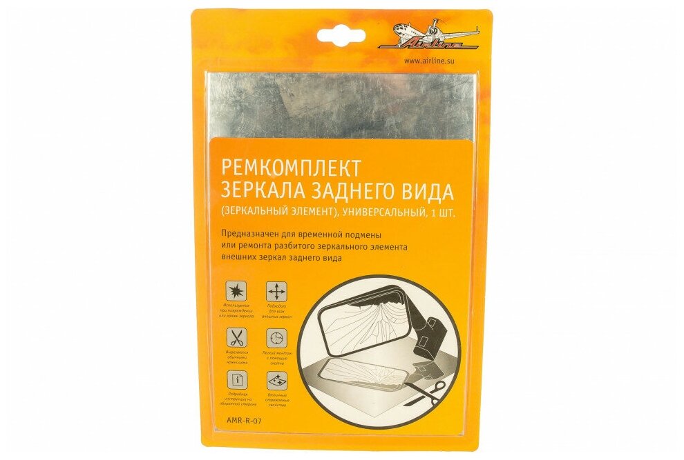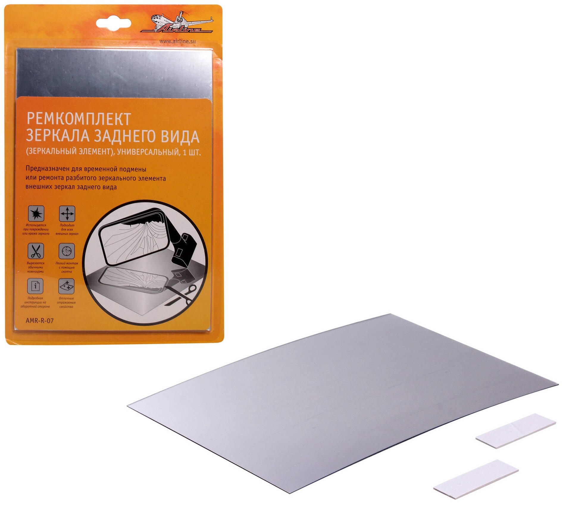 Ремкомплект зеркала заднего вида предназначен для временной подмены или ремонта разбитого зеркального элемента внешних зеркал заднего вида. Используется при повреждении или краже зеркального элемента и подходит для всех внешних зеркал. При возникшей необходимости зеркальный элемент вырезается обычными ножницами и легко монтируется с помощью двустороннего скотча. Зеркальный элемент имеет хорошие отражаемые свойства, которые помогут без труда пользоваться автомобилем первое время до установки штатного зеркала.