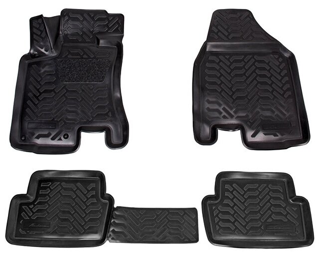 Ковры изготовлены из современного полимера ТЭП, который не теряет эластичность и сохраняет форму при пониженных и повышенных температурах. Ковры идеально повторяют форму пола выбранного автомобиля за счет снятия его индивидуальных размеров 3D сканером. Ковры имеют современный рисунок имитирующий протектор шин. У большинства моделей водительский коврик имеет ворсовый подпятник для предотвращения соскальзывания ноги, а так же оснащены крепежом для крепления их в штатных местах. Ковры преображают вид салона автомобиля и защищают напольный ковролин от истирания, намокания и загрязнений на долгое время. Преимущества ковров: эластичный материал стойкие к повышенным и пониженным температурам (- 40/+ 65 ?С) идеально повторяют форму пола авто(3D сканирование) не имеют неприятного запахавысокие бортикимодный дизайн