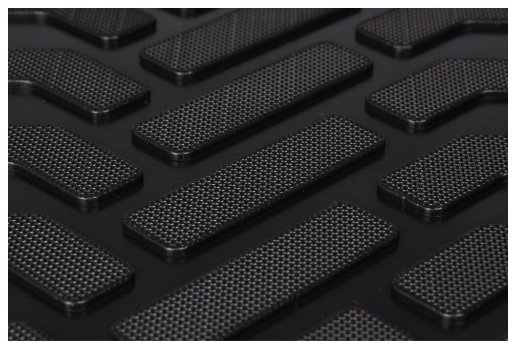 Ковры изготовлены из современного полимера ТЭП, который не теряет эластичность и сохраняет форму при пониженных и повышенных температурах. Ковры идеально повторяют форму пола выбранного автомобиля за счет снятия его индивидуальных размеров 3D сканером. Ковры имеют современный рисунок имитирующий протектор шин. У большинства моделей водительский коврик имеет ворсовый подпятник для предотвращения соскальзывания ноги, а так же оснащены крепежом для крепления их в штатных местах. Ковры преображают вид салона автомобиля и защищают напольный ковролин от истирания, намокания и загрязнений на долгое время. Преимущества ковров: эластичный материал стойкие к повышенным и пониженным температурам (- 40/+ 65 ?С) идеально повторяют форму пола авто(3D сканирование) не имеют неприятного запахавысокие бортикимодный дизайн
