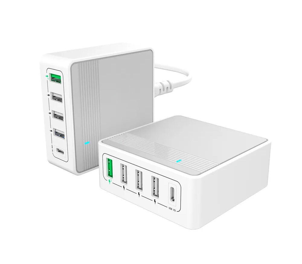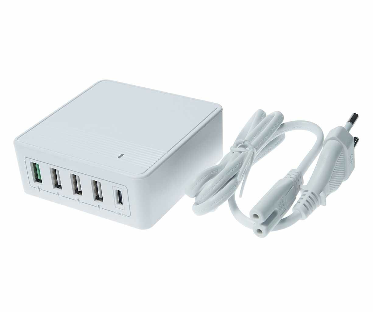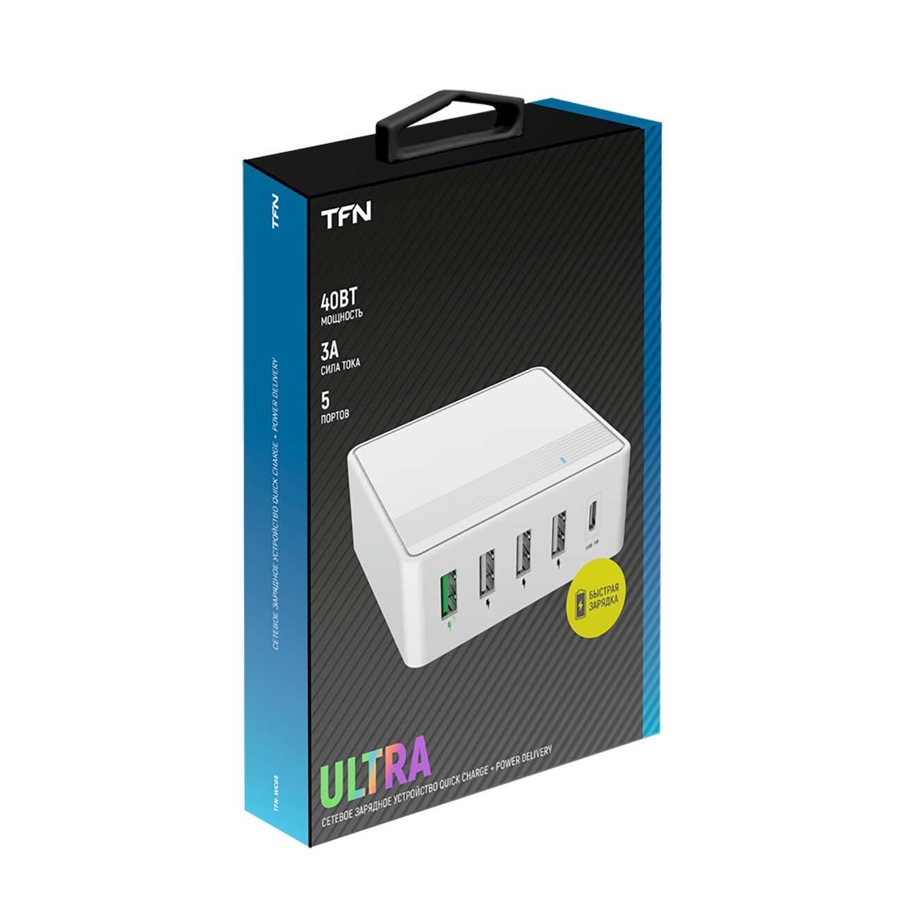 TFN — сетевое зарядное устройство с пятью портами: USB 2.0 и USB Type C. Модель работает от сети 220 В и поддерживает функцию быстрой зарядки. Провод для подключения мобильных устройств в комплект не входит.