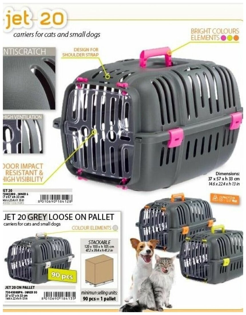 Переноска JET 20 для домашних животных специально разработана для небольших собак и кошек. Этот инновационный контейнер оригинальной округлой формы изготовлен из пластика и оснащён большими вентиляционными решётками для обеспечения оптимального комфорта вашему четвероногому другу во время автомобильных поездок. Также его можно перевозить в поездах, кораблях и самолётах.
