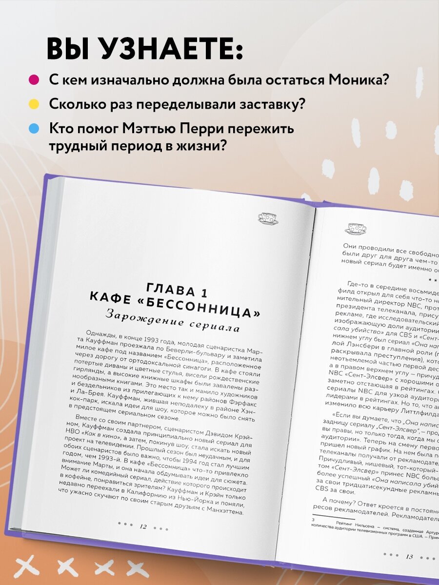 Из этой книги вы узнаете, как "Друзья" дошли до экранов и почему никто не сможет создать что-то похожее. Автор проведет вас за кулисы создания культового сериала, проанализирует основные сюжетные линии и расскажет, как снимался каждый сезон, как писались шутки и насколько финал сериала далек от первоначальной задумки. Какие-то факты вы уже знали, какие-то вам только предстоит узнать, но это путешествие в ностальгический мир "Друзей" однозначно стоит того!