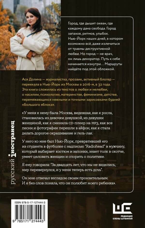 Ася Долина - журналистка, прозаик, активный блогер - переехала в Нью-Йорк из Москвы в 2016-м, в 32 года. Эта книга сложилась из текстов о любви и нелюбви, о насилии, психологии, материнстве, феминизме, детстве, перемежающихся нежными и точными зарисовками будней "Большого яблока".