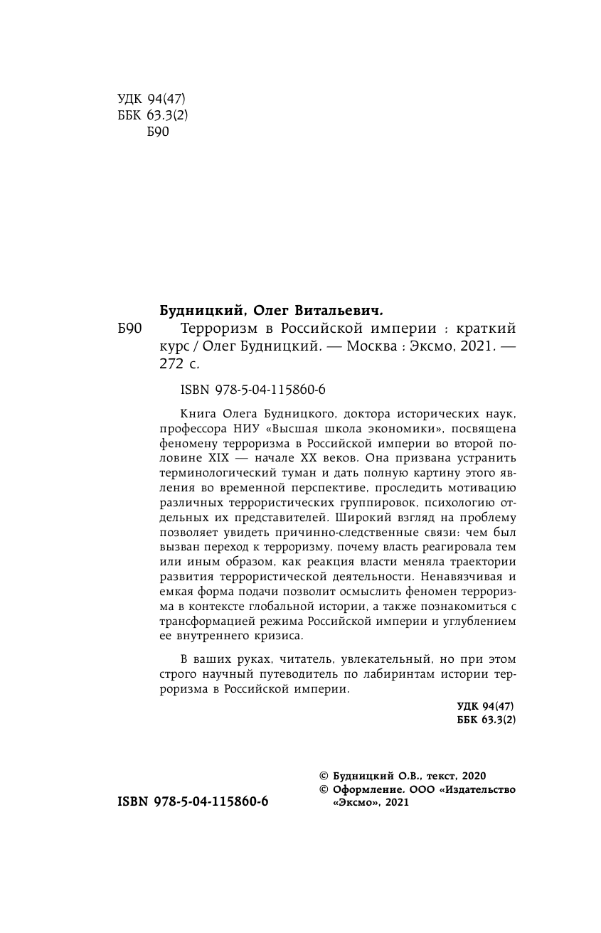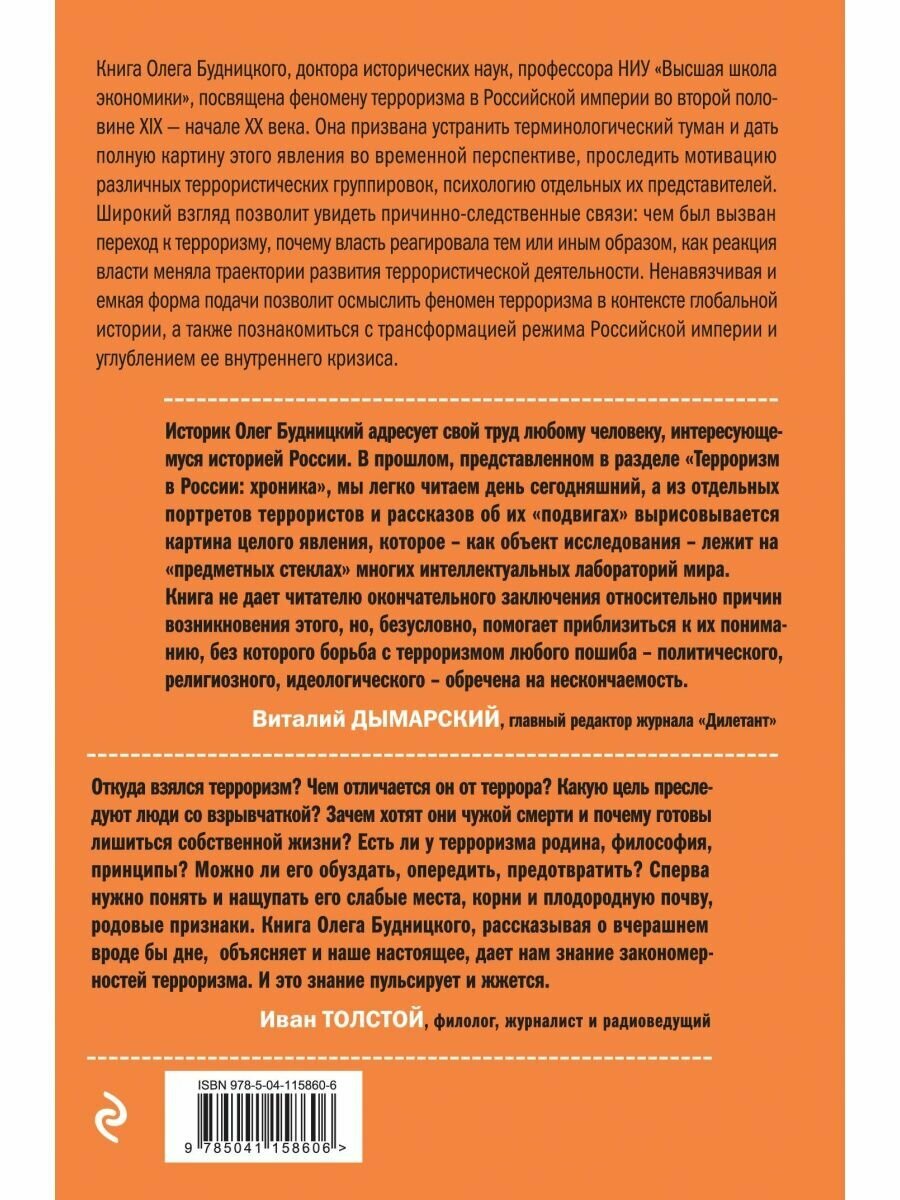 Книга Олега Будницкого, доктора исторических наук, профессора НИУ "Высшая школа экономики", посвящена феномену терроризма в Российской империи во второй половине XIX - начале XX веков. Она призвана устранить терминологический туман и дать полную картину этого явления во временной перспективе, проследить мотивацию различных террористических группировок, психологию отдельных их представителей. Широкий взгляд позволит увидеть причинно-следственные связи: чем был вызван переход к терроризму, почему власть реагировала тем или иным образом, как реакция власти меняла траектории развития террористической деятельности. Ненавязчивая и емкая форма подачи позволит осмыслить феномен терроризма в контексте глобальной истории, а также познакомиться с трансформацией режима Российской империи и углублением ее внутреннего кризиса.