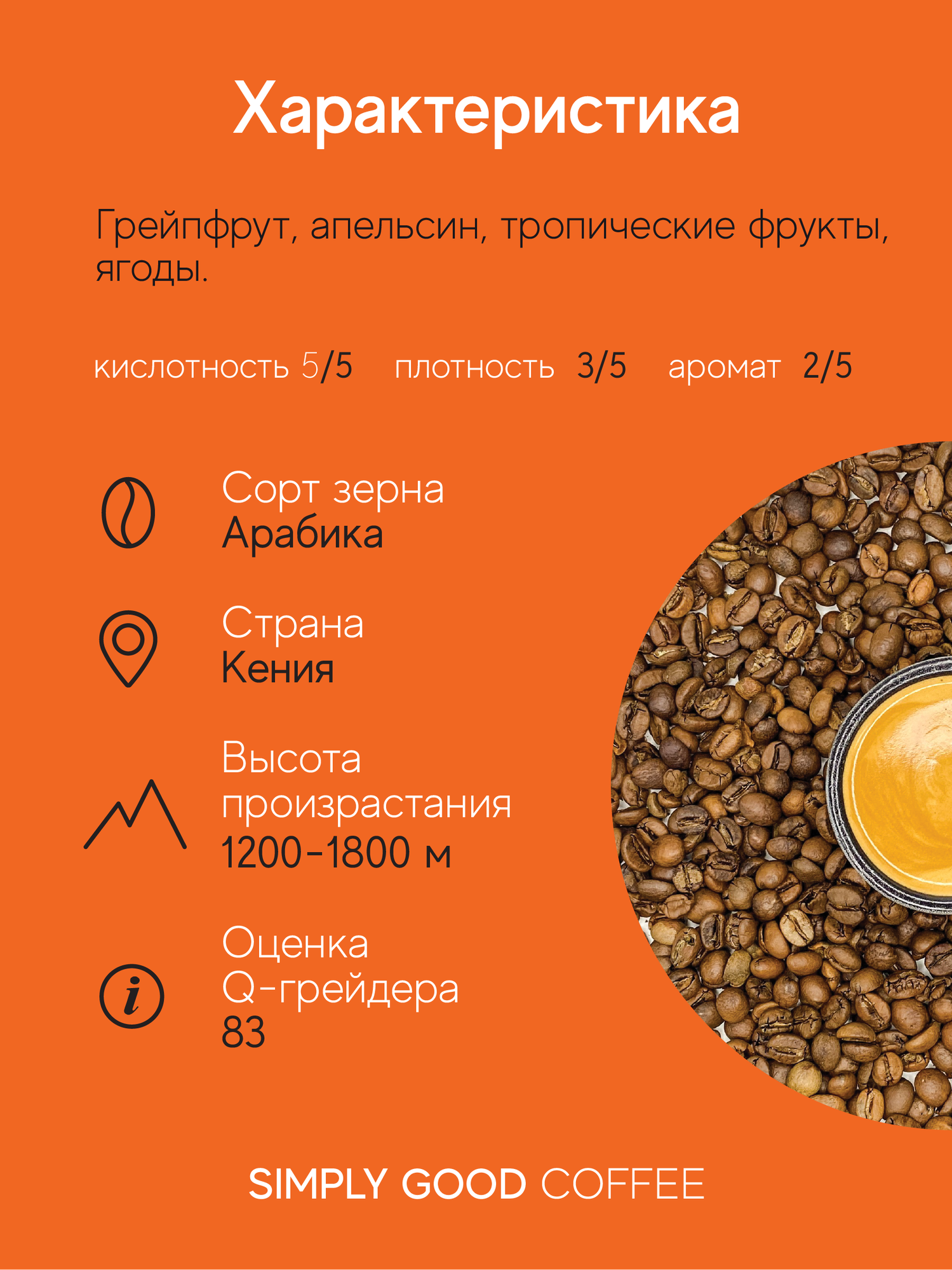 Кофе с плотной грейпфрутово-апельсиновой кислинкой, нотками экзотических фруктов и ягод, дорогого вина, цветов, свежеиспеченного черного хлеба.