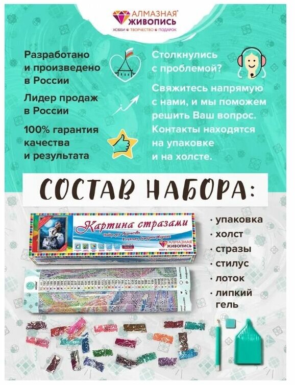 | В набор входит | полотно-схема с клеевым слоем, с условными обозначениями, инструкция, пластиковое блюдце, стилус, упакованные стразы |