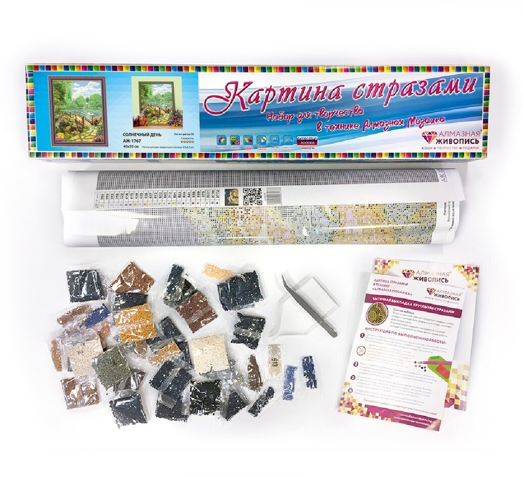 | Комплектация | полотно-схема с клеевым слоем с условными обозначениями; инструкция; пластиковое блюдце; пинцет; упакованные стразы |