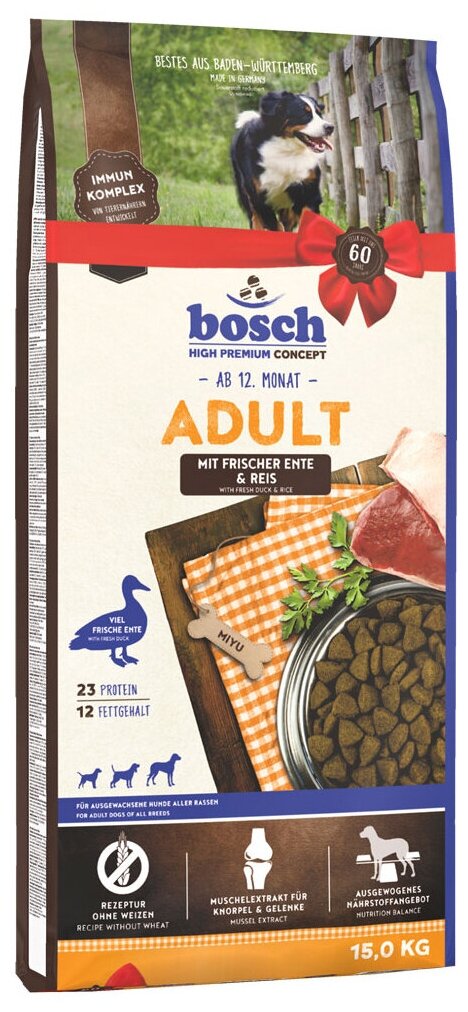 Bosch Adult с уткой и рисом предназначен для взрослых собак всех пород