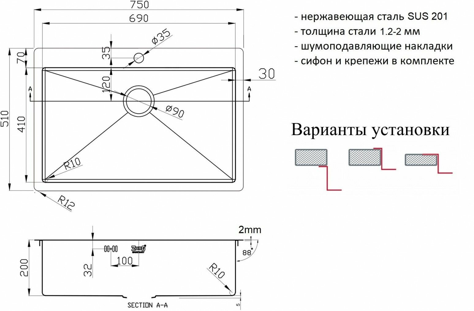 | Толщина материала мойки | 2 |